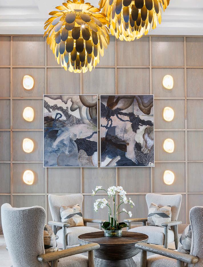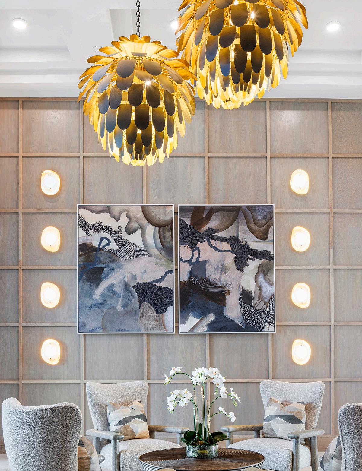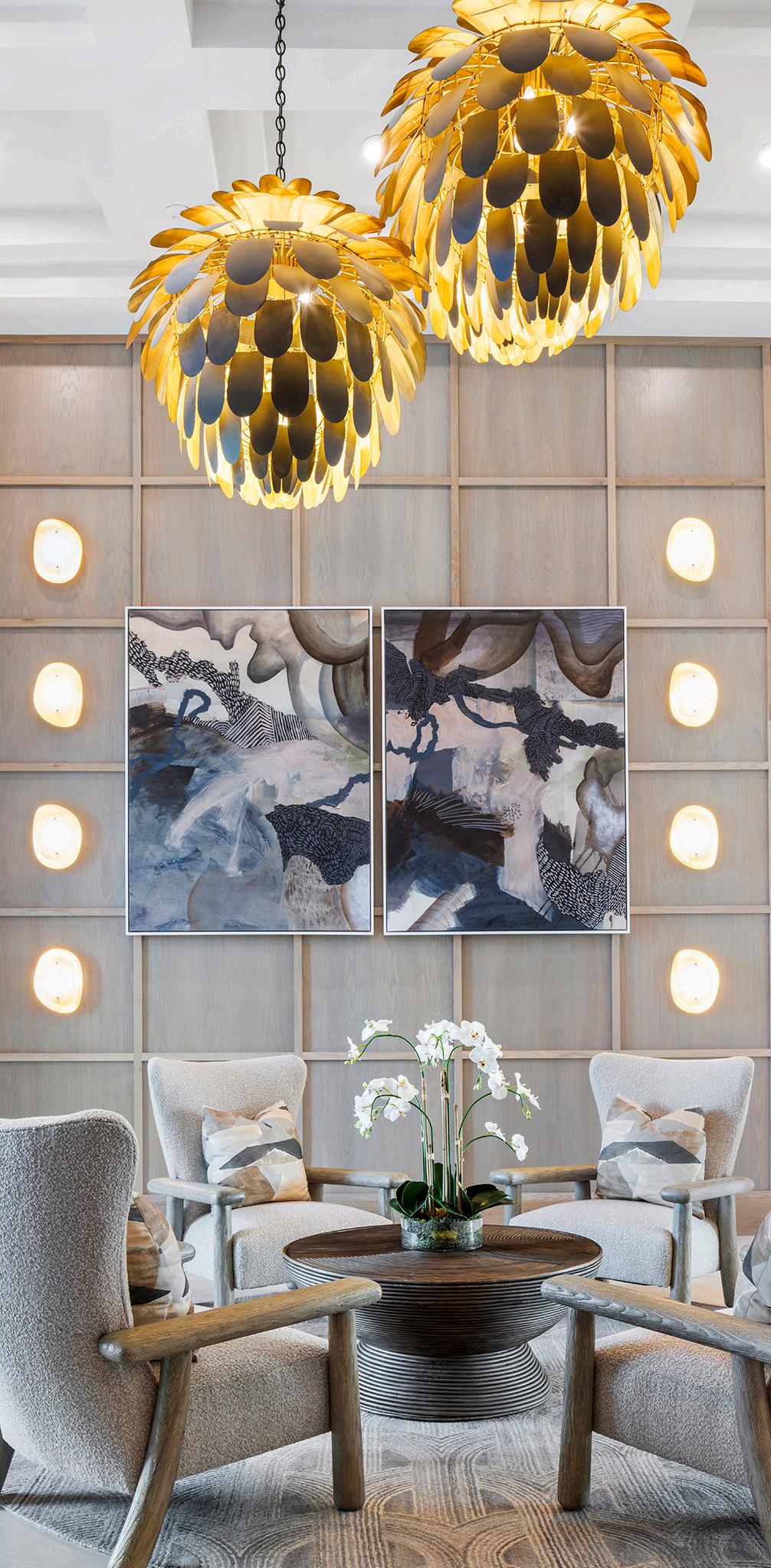Residential-inspired, high-performance furnishings—including leather-embossed vinyl, textured tweeds, and woven suedes—create a comfortable, durable environment. Brass and black lighting, accent tables, and furniture bases add contrast and visual depth throughout.