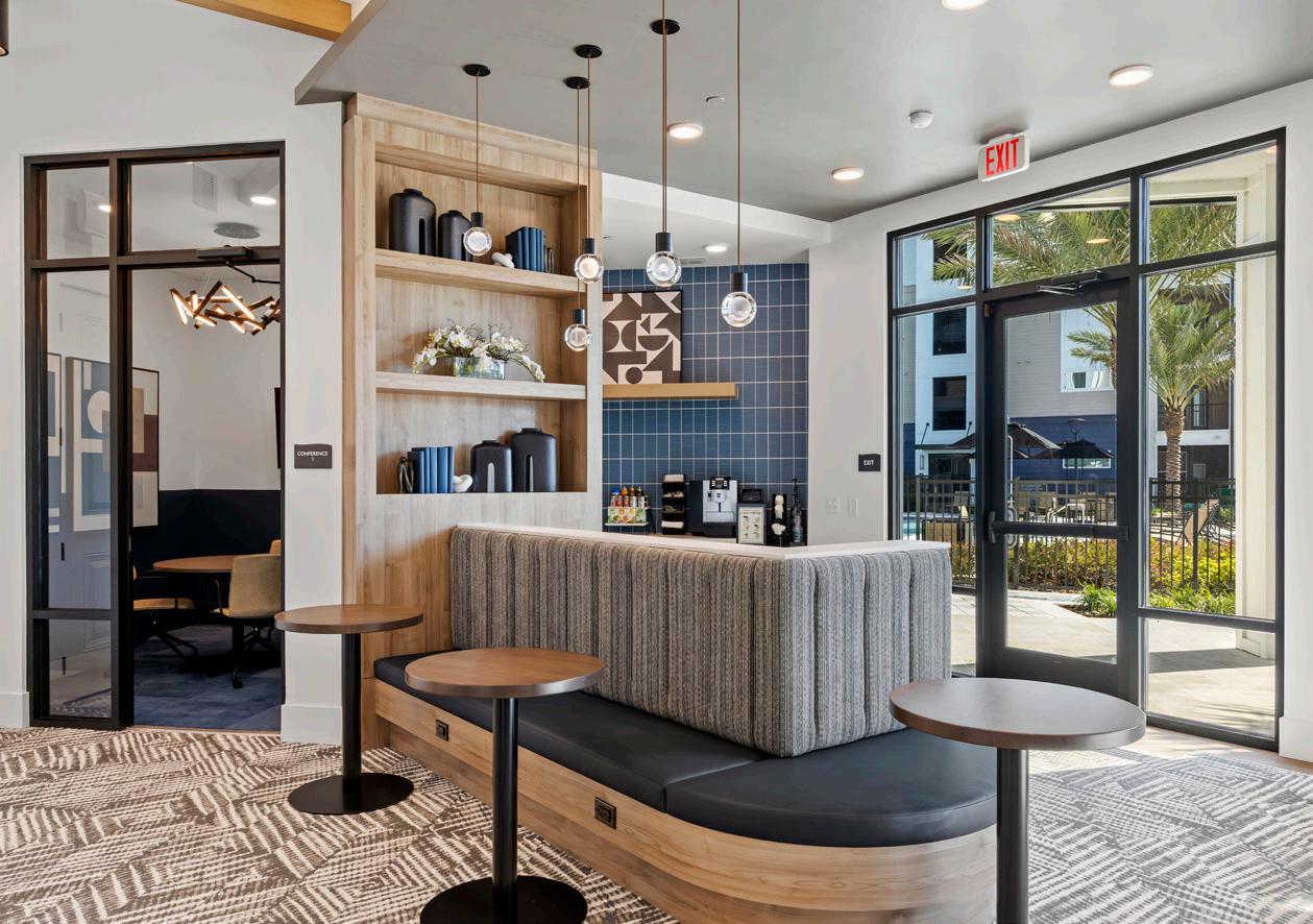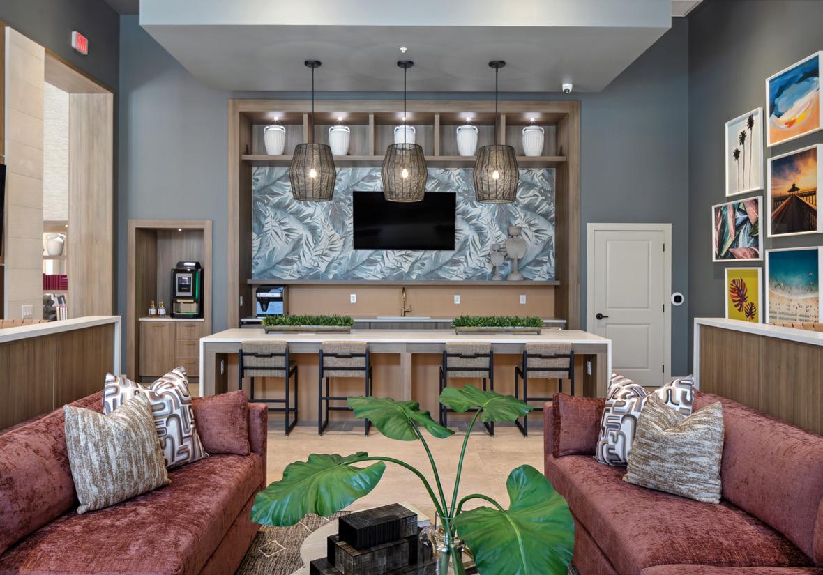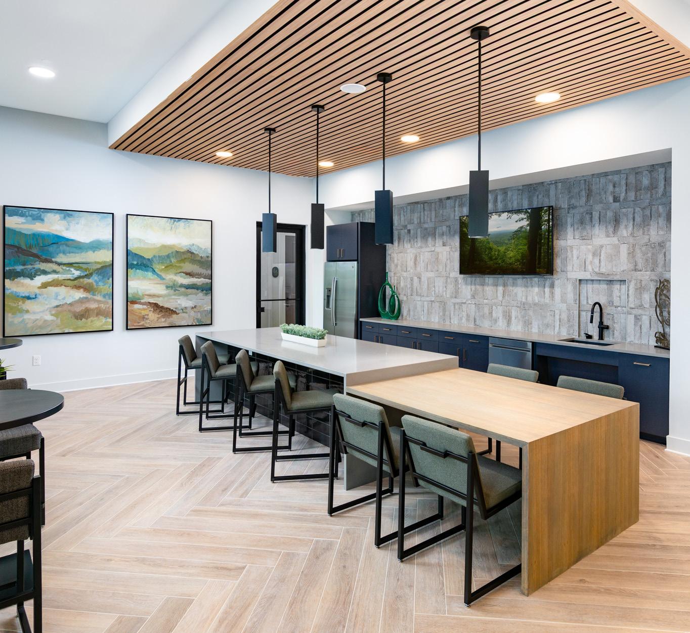 Adjacent to reception, the business center includes a conference room and micro-offices designed to support modern work needs. An open clubroom and kitchenette maximize functionality, featuring a two-tier kitchen island suited for resident gatherings.