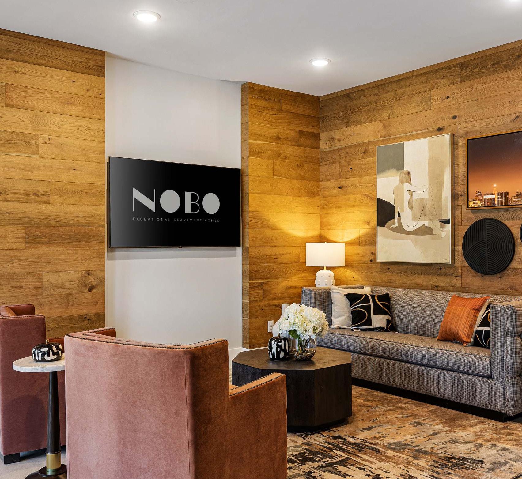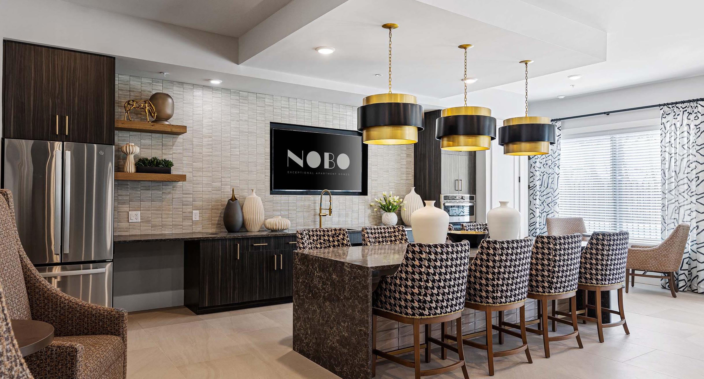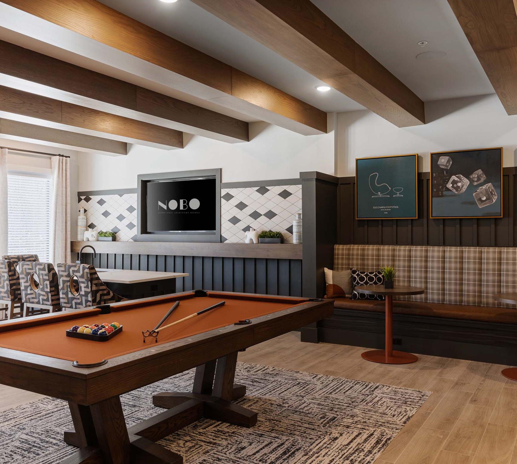 The interior amenities were designed to reflect an upscale residential aesthetic—clean, impactful, and grounded in textural neutrals and muted tones. Light-to-medium wood finishes and white walls highlight architectural details, furnishings, tile work, and curated artwork, including a bear photograph that subtly references the property’s name, derived from the Creek Indian word nokose.