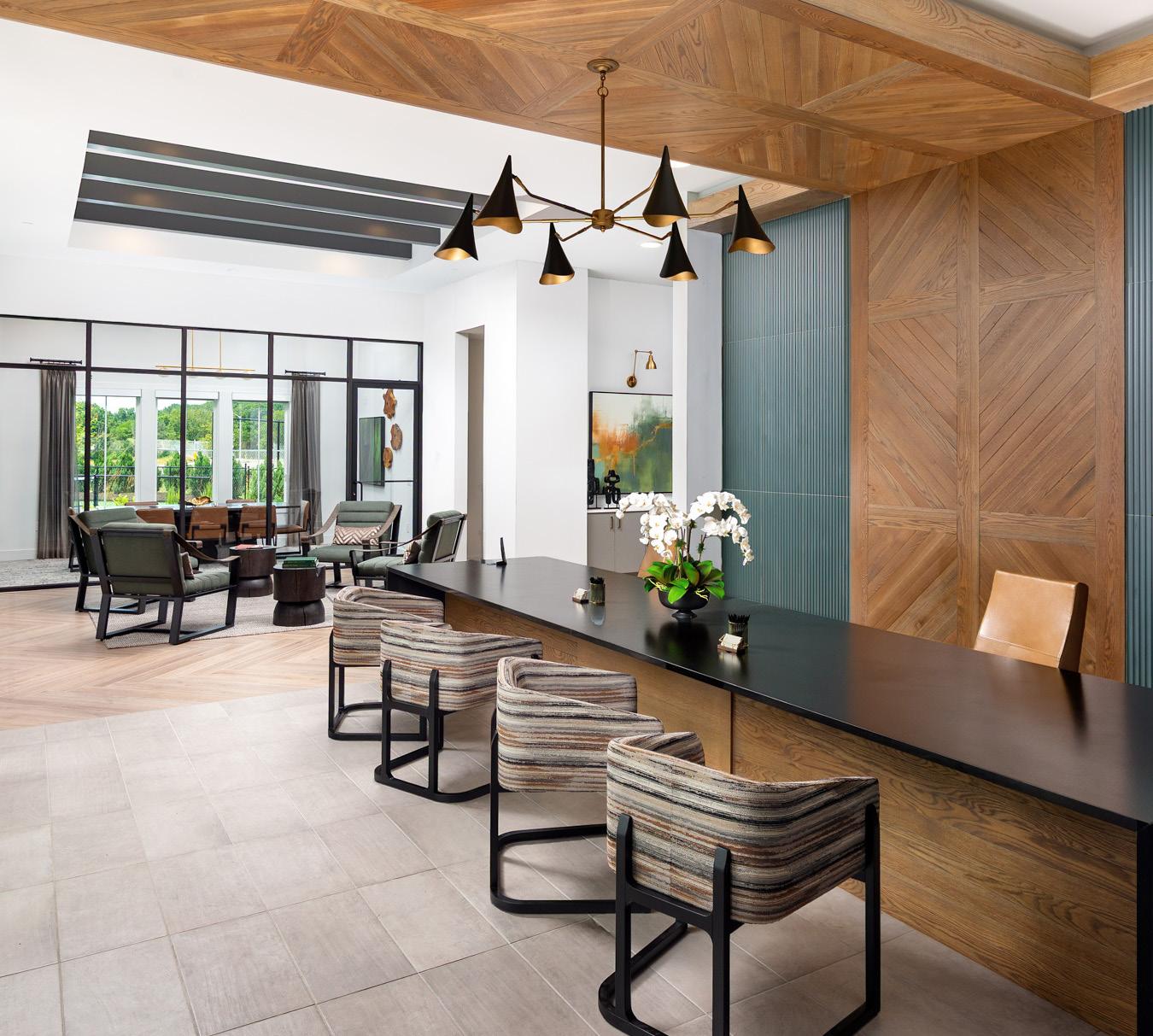 The 5,000-square-foot clubhouse opens to a welcoming reception area with a built-in leasing desk and wood-and-tile feature wall.