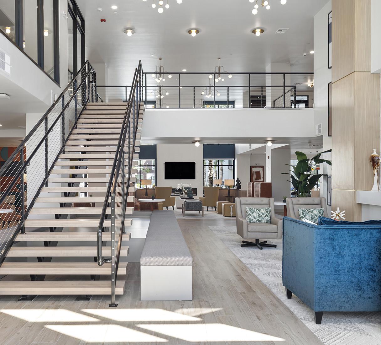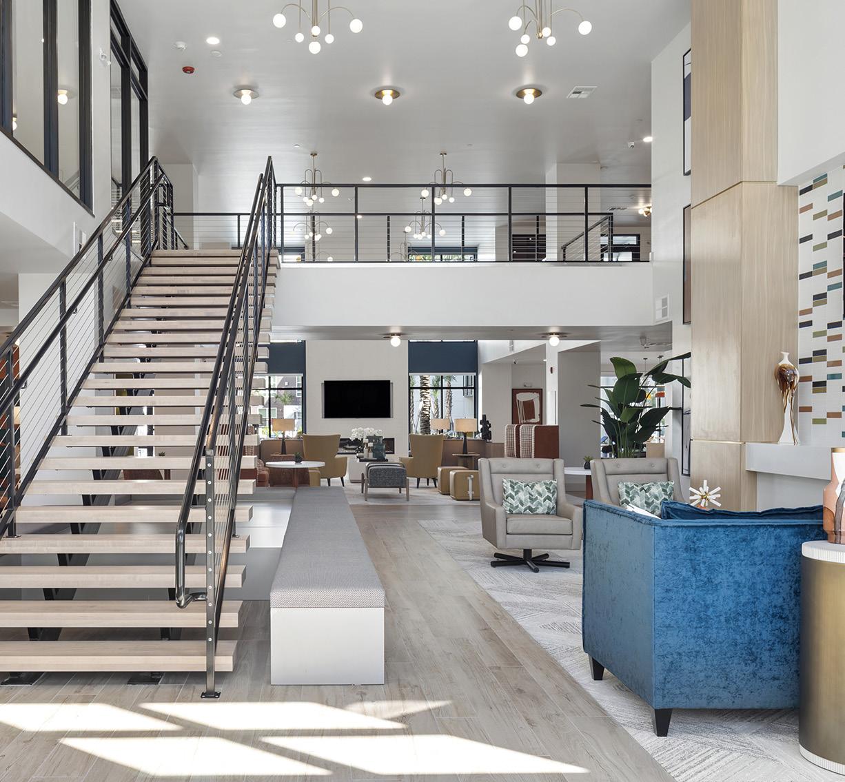 Inside, a two-story clubhouse welcomes residents with a grand staircase and direct views to a large courtyard and resort-style pool. Additional amenities include co-working spaces, a 24-hour fitness center with a yoga studio, a game lounge with an arcade and golf simulator, outdoor grilling areas, a dog park, and electric vehicle charging stations.