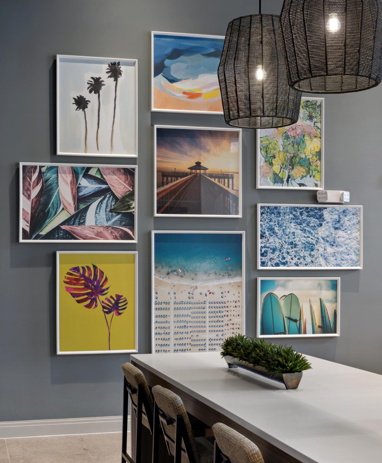 The Entry Lobby makes a strong first impression with ceiling wood beams and a moss wall paired with a neon sign. In the Game Room, a vibrant wallcovering and art collage showcase aerial beach imagery and curated local photography, reinforcing a strong connection to Fort Myers.