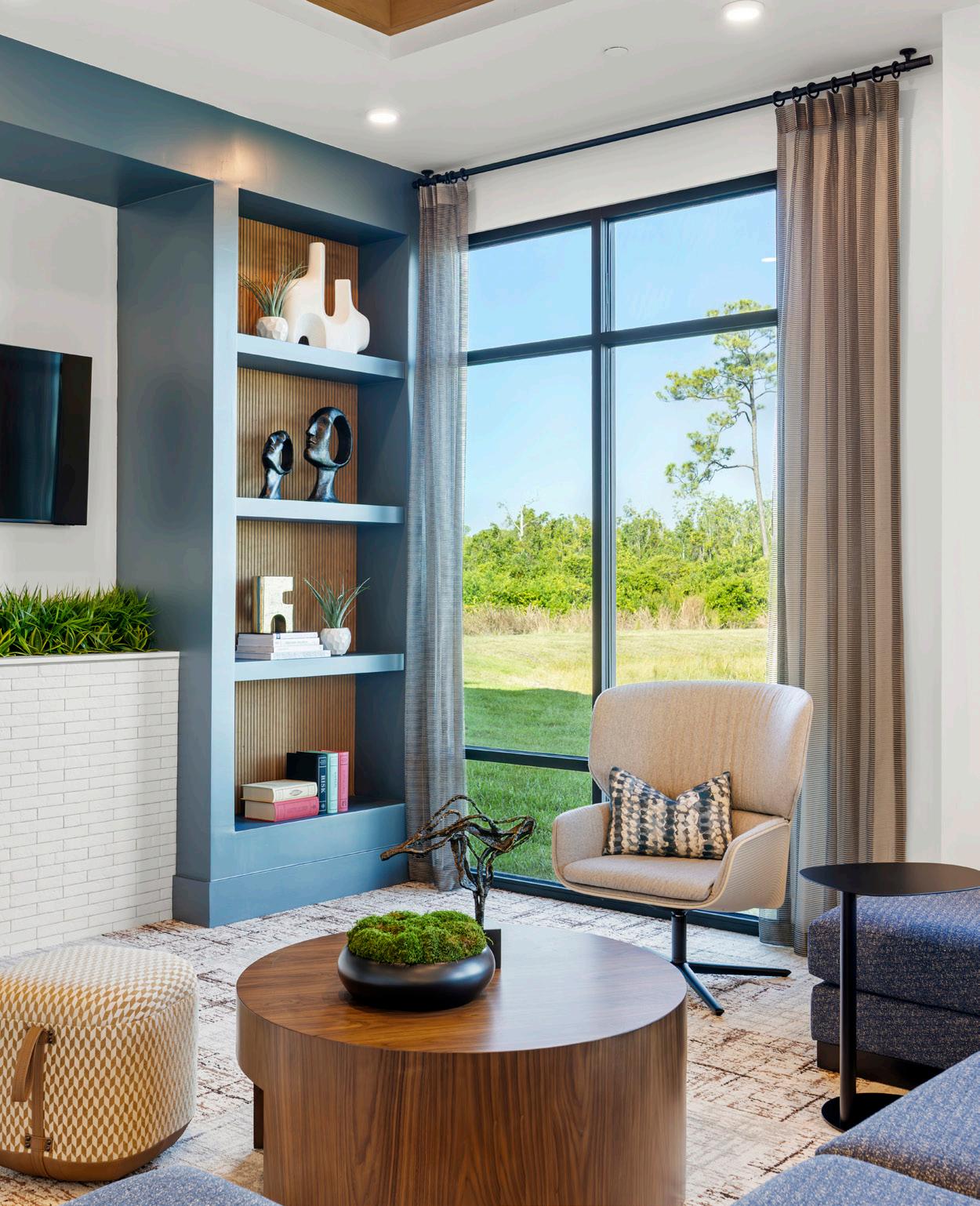 Inspired by Tampa’s Oxford Exchange, the design features a refined, understated aesthetic with a palette of British tans and eucalyptus greens, elevated finishes, and curated artwork that reflects local history. The open-plan clubhouse offers a warm, welcoming environment with bistro-style seating designed for work-fromhome and social use.