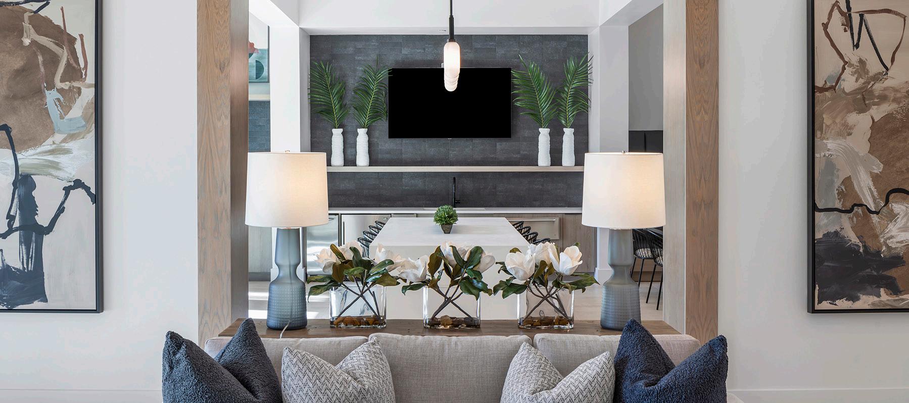 Encore Echo’s 9,250 SF clubhouse features a refined modern-transitional design with Corten steel accents, tropical influences, and rich jewel tones. Ash-toned wood details unify the amenity spaces, while soft grey-blue and deep green accent walls provide a calm, contemporary backdrop.