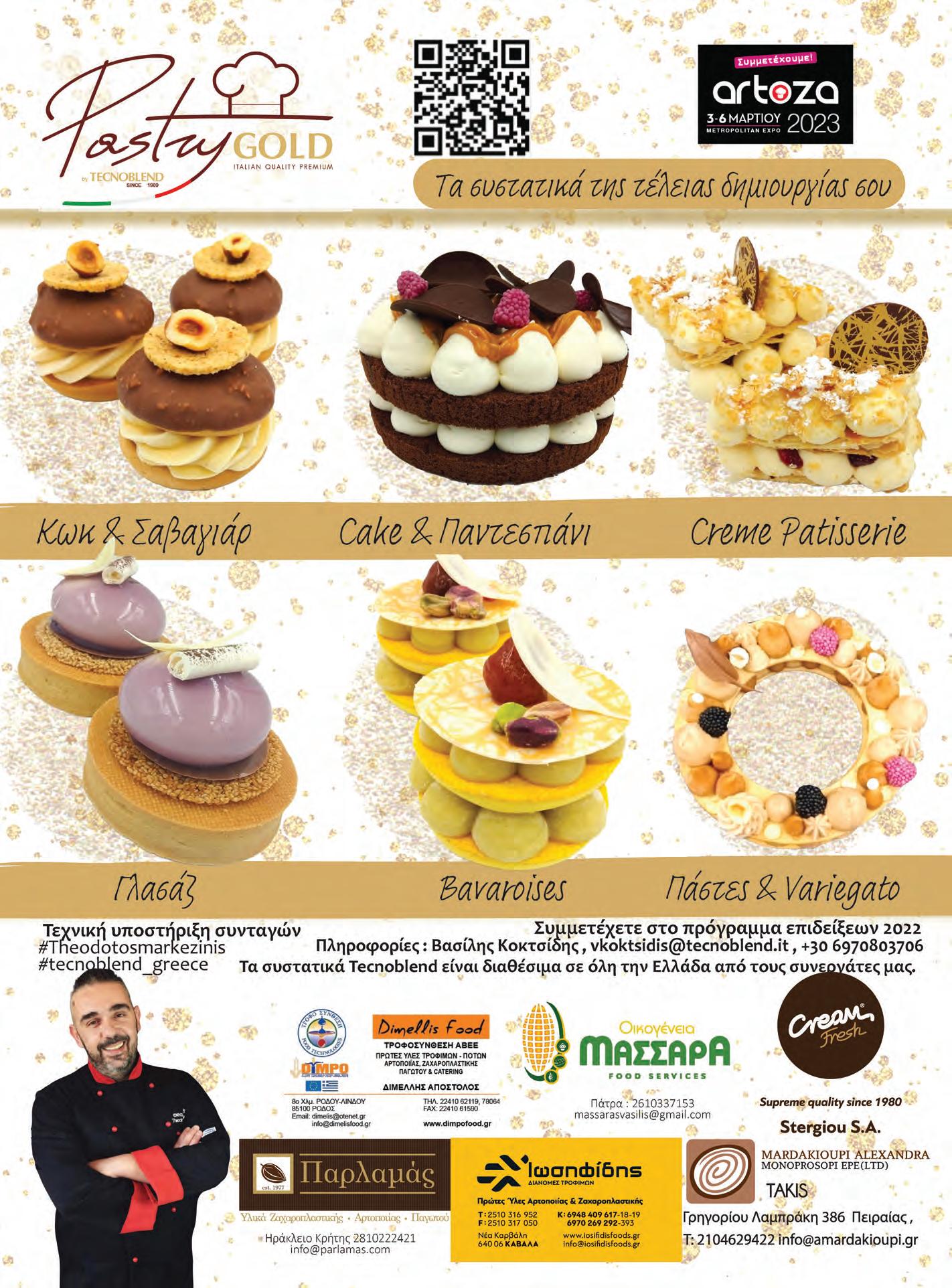 Κωδικοί που θα κυριαρχήσουν φέτος τα Χριστούγεννα, οι πρωτα γωνιστές του αφιερώματος. Νίκος Λούλης, συνεχιστής παράδοσης 2,5 αιώνων και ο "ιθύνων νους" της νέας εποχής. MEΛΟΣ ISSN 2241-5483 ΙΔΡΥΤΗΣ-ΕΠΙΤΙΜΟΣ ΠΡ Ο Ε ΔΡΟΣ Νίκος Χουδαλάκης ΔΙΕΥΘΥΝΩΝ ΣΥΜΒΟΥΛΟΣ Θάνος Παναγούλιας ΕΚΔΟΤΗΣ Θανάσης Γιαλούρης ΔΙΕΥΘΥNTΡΙΑ ΣΥΝΤΑΞΗΣ Πηνελόπη Καράμπελα (pk@forumsa.gr) ART DIRECTOR Δέσποινα Σακελλαρίδου ΣΥΝΤAΞΗ Πέτρος Πουλόπουλος (pp@forumsa.gr) Φώτης Τσολάκος (ft@forumsa.gr) Παναγιώτα Κότσαλη (pko@forumsa.gr) ΦΩTOΓPAΦIEΣ Δημήτρης Tσίτσος Βασίλης Λαδικός Μιχάλης Σπυρόπουλος ΔΙΕΥΘΥΝΣΗ ΠΩΛΗΣΕΩΝ Κάτια Μολφέτα (km@forumsa.gr, sales@forumsa.gr) Δ IAΦHMIΣEIΣ Θανάσης Mπελεκούκιας Αριστέα Καλιαντζή Αρετή Μουράτη Δημήτρης Μιχαλόχρηστας Γιάννης Μαργέλης Γιώργος Θεοδωρόπουλος Νίκος Κούμανης Μίλτος Μέλλιος ΓΡΑΜΜΑΤΕΙΑ ΠΩΛΗΣΕΩΝ Mορφούλα Σπιχοπούλου Πέρσυ Γρηγοράτου ΔΙΕΘΝΕ Ι Σ ΣΧ Ε Σ ΕΙΣ Φίλιππος Παπαναστασίου COMMUNICATION MANAGER Κατερίνα Κωνσταντοπούλου DIGITAL MANAGER Κατερίνα Κόκκινου DIGITAL CONTENT SPECIALIST Ελεάνα Κηπουρού DIGITAL ΑSSISTANT Στεφανία Χρήστου APXEIO - ΣYN Δ PO MEΣ Αλ. Κακάβα, Δήμ. Έλληνα ΕΠΕΞΕΡΓΑΣΙΑ ΕΙΚΟΝΑΣ Γωγώ Τρικεριώτη ΣΥΝΔΡΟΜΕΣ (ΕΤΗΣΙΕΣ) ΕΣΩΤΕΡΙΚΟ 20€, ΚΥΠΡΟΣ & ΕΞΩΤΕΡΙΚΟ 60€ EKTYΠΩΣH - BIBΛIOΔ E ΣIA ΜΠΑΞΑΣ AE ΙΔΙΟΚΤΗΣΙΑ FORUM AE, Member of NürnbergMesse Group Λ. Βουλιαγμένης 328, 173 42 Αγ. Δημήτριος, Τηλ.: 210 5242100, Fax: 210 5246581 info@forumsa.gr, www.forummagazines.gr Α-Ζ ΟΚΤΩΒΡΙΟΣ 2022 Εξαιρετικά σοκολατένια προϊόντα για εγγυημένα αποτελέσματα από την ΚΟΝΤΑ. ΙNDEX AZ Aρτοποιία - Ζαχαροπλαστική ΟΚΤ Ω Β ΡΙΟΣ 2022 10 ΕΙΔΗΣΕΙΣ Τα τελευταία νέα της αγοράς και τα παραλειπόμενα, όπως τα ξεχωρίζει η ομάδα του Α-Ζ. 28 ΑΦΙΕΡΩΜΑ Εντυπωσιακές προτάσεις και νέες τάσεις για τα φετινά Χριστούγεννα παρουσιάζονται