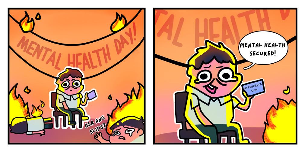 Kanang malipay na unta ka kay makapahuway na human ang makabogo nga exam—mao man siguro na pagsabot sa tanan sa Mental Health Day? Pero nganong gibutngan man ni ninyo’g attendance, mamser? Nindot man ang idea nga mag-mingle-mingle mi sa among schoolmates noh, pero mas nindot kung nagpabilin lang siya nga idea! Naa baya’y uban nga mas kailangang matulog, mopauli, o molaag para malimtan ang score. Dili kay ipriso na lang sa eskwelahan tungod sa attendance!