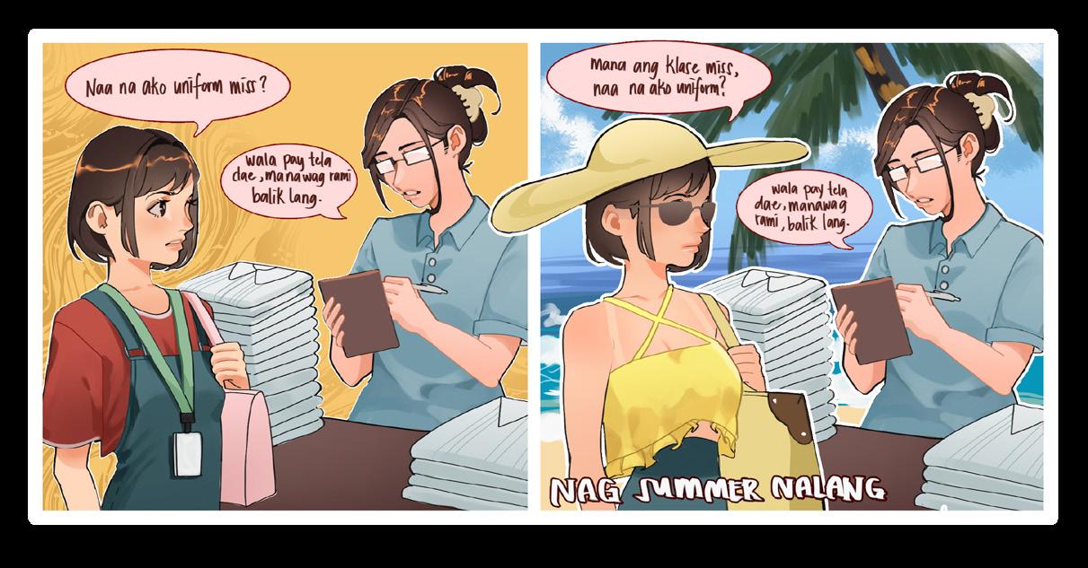 Di sad lalim magbalik-balik pangutana kung nahuman na ba og tahi atong uniform ay! Mura ta’g guba nga plaka, ang tubag sad balik-balik ra: “Wala pa man tela, balik lang.” Asa man diay na kuhaon ba? Nag-summer na lang, wala gihapon. Unya inig balik sa klase, civilian na pud? Kapoya na’g laba!