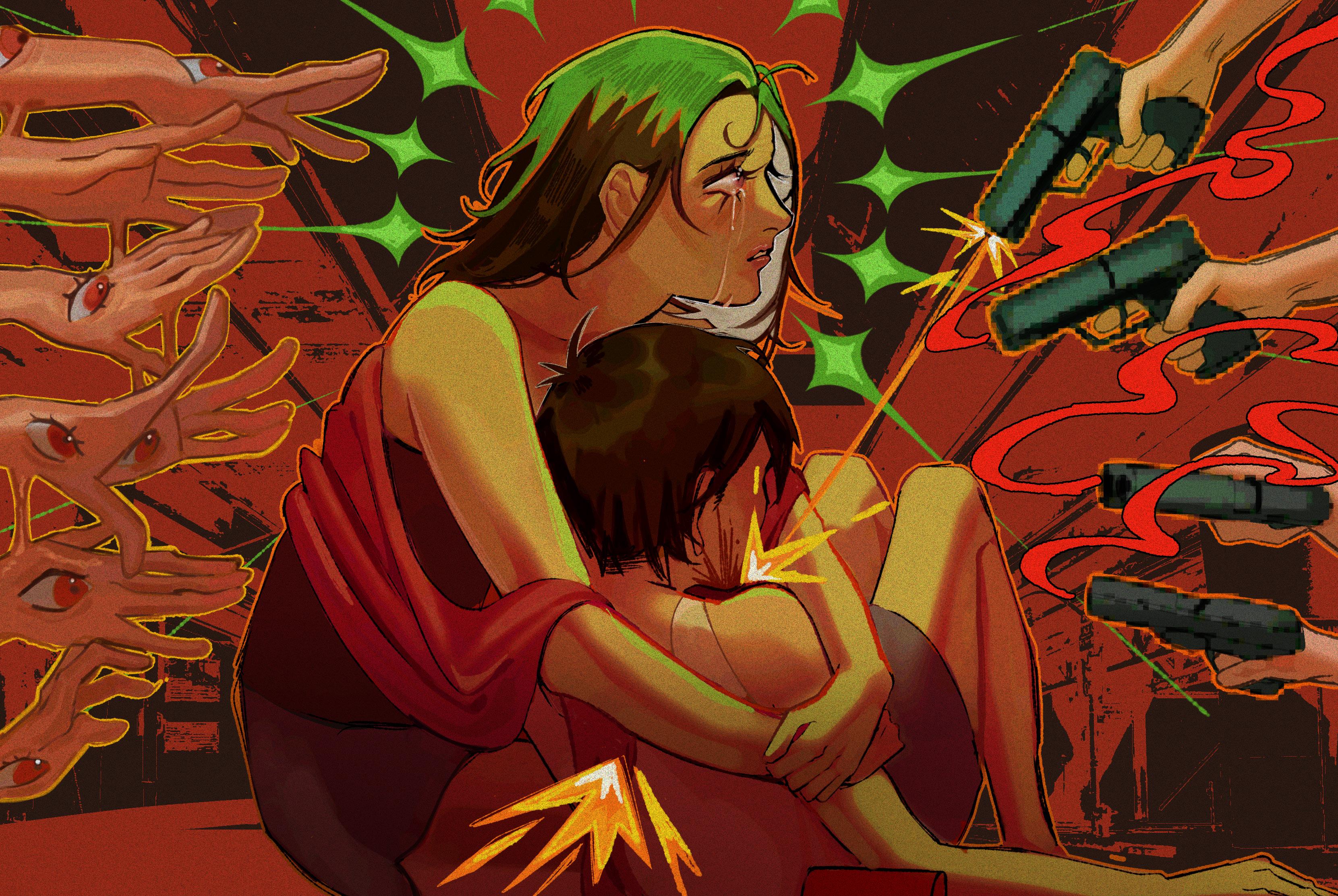 Hands grasp, unyielding. A soul curls inward, hiding, yet seen.