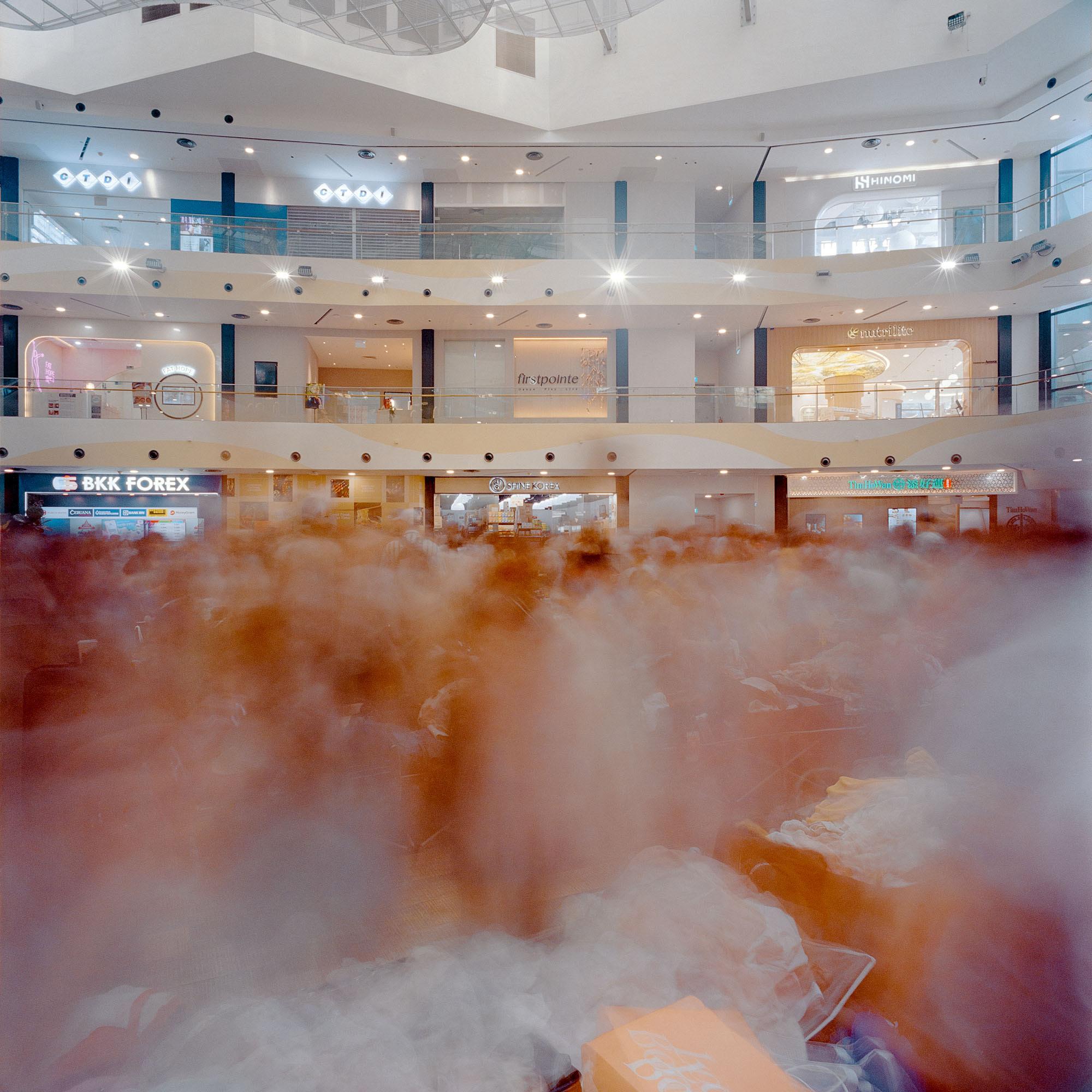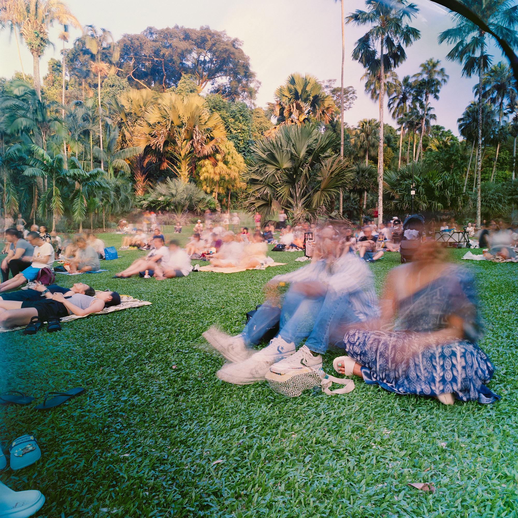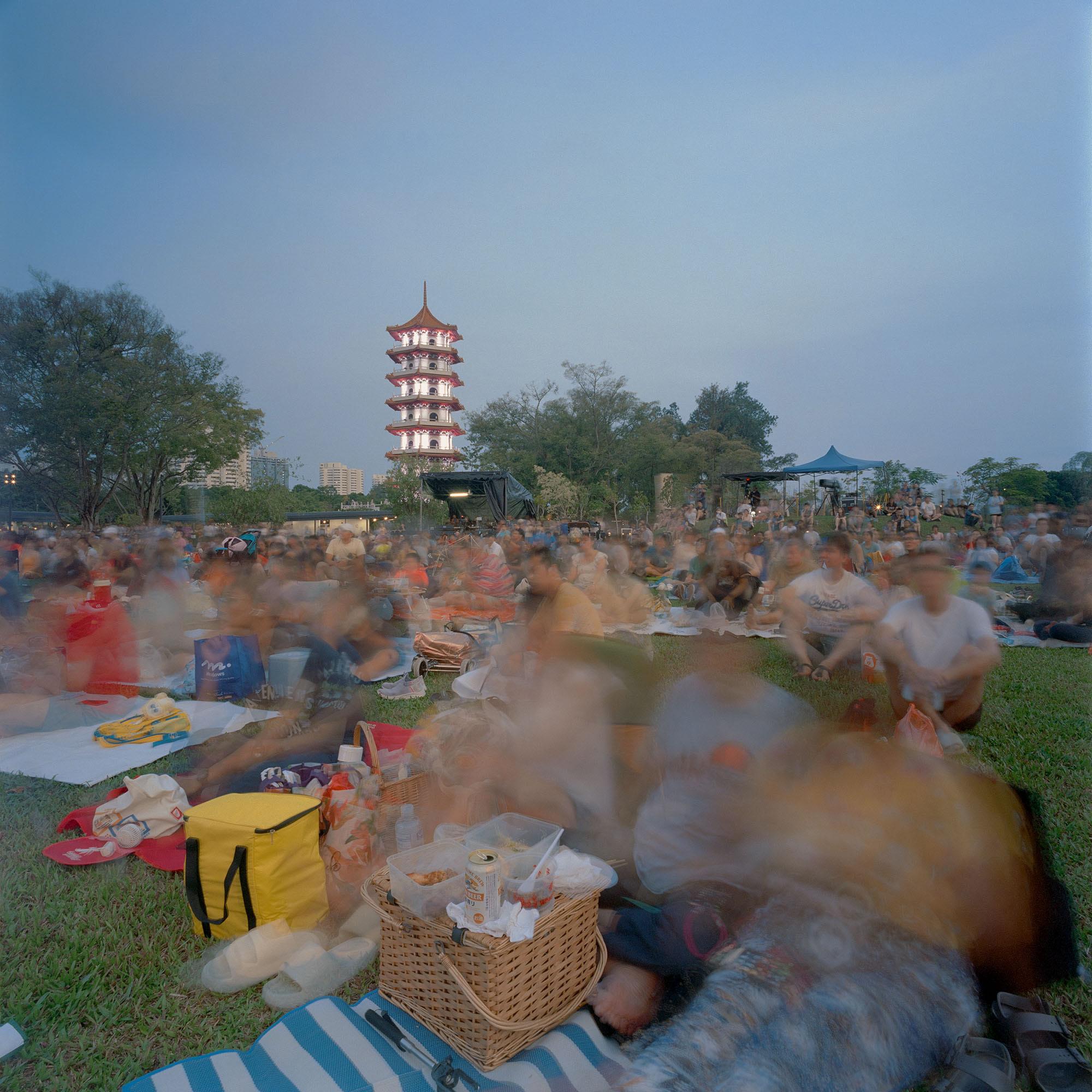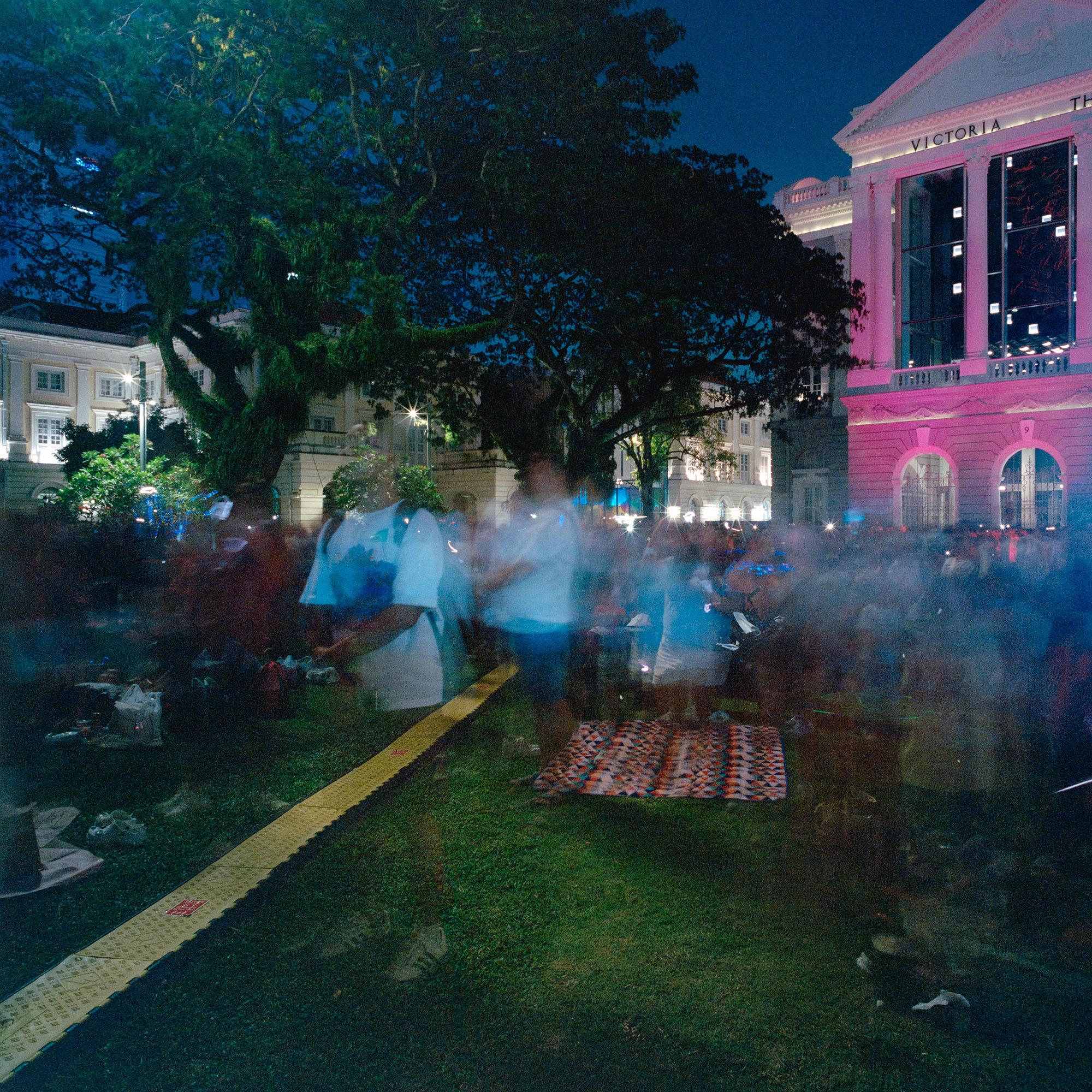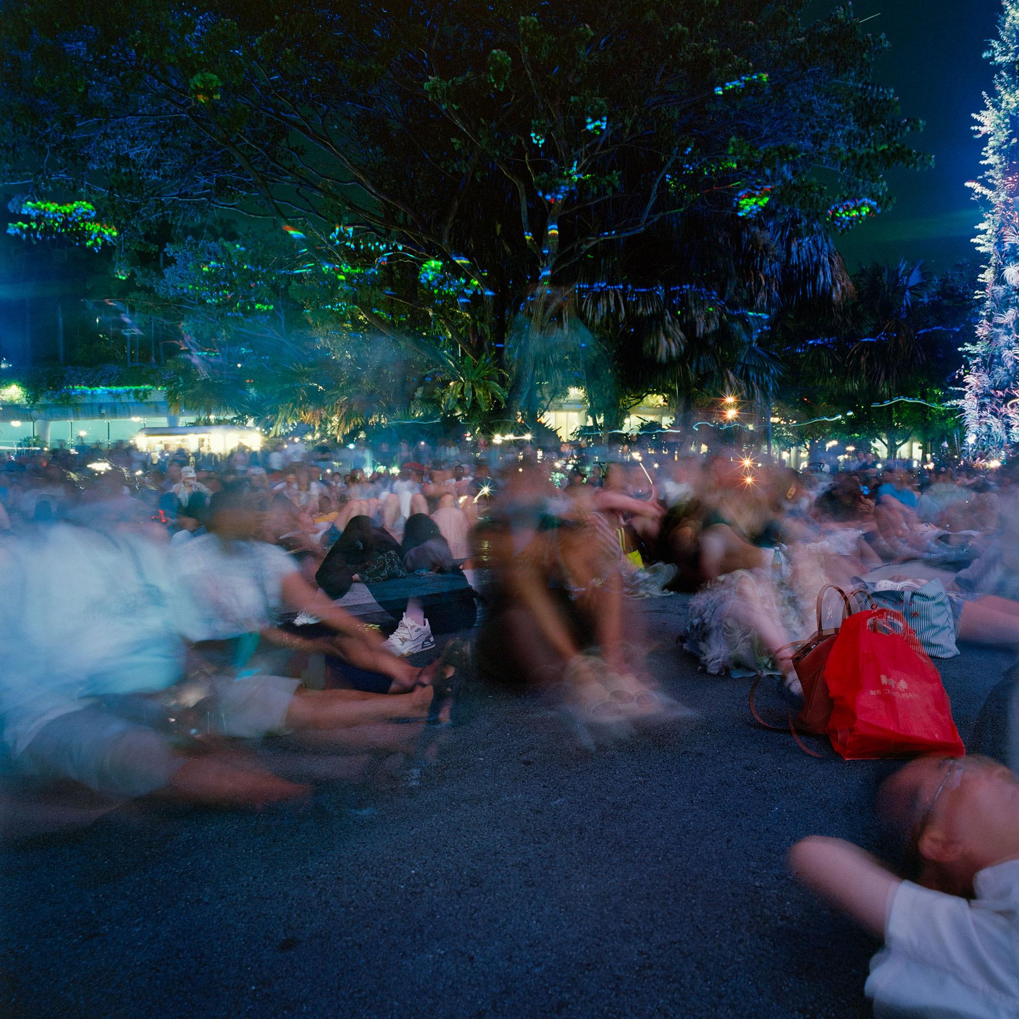 Just as impressions of individuals weave in and out of her images, never staying stationary long enough to be clearly recorded by the camera, Chang expresses the crowd as an unstable state of existence, which momentarily coalesces around a convergence of desires, needs and interests. For collectivity is neither monolithic nor permanent. It lasts for only as long as its members share a common purpose, be it to shop at thrift markets, to attend lectures, to partake in festive celebrations (Christmas, Mid-Autumn Festival, National Day) or to spend time at iconic landmarks in Singapore (Gardens by the Bay, Merlion Park, Singapore Botanic Gardens). Its contours are constantly shifting and its size fluctuating as some people arrive while others leave. Chang recounted with wistfulness the small moments of personal interaction she had had with individuals in the crowd, for she was acutely conscious of the fact that they might never cross paths again following the conclusion of the activity and the inevitable dispersal of the crowd.