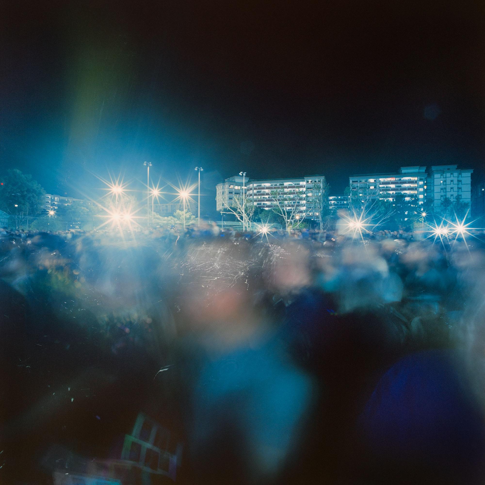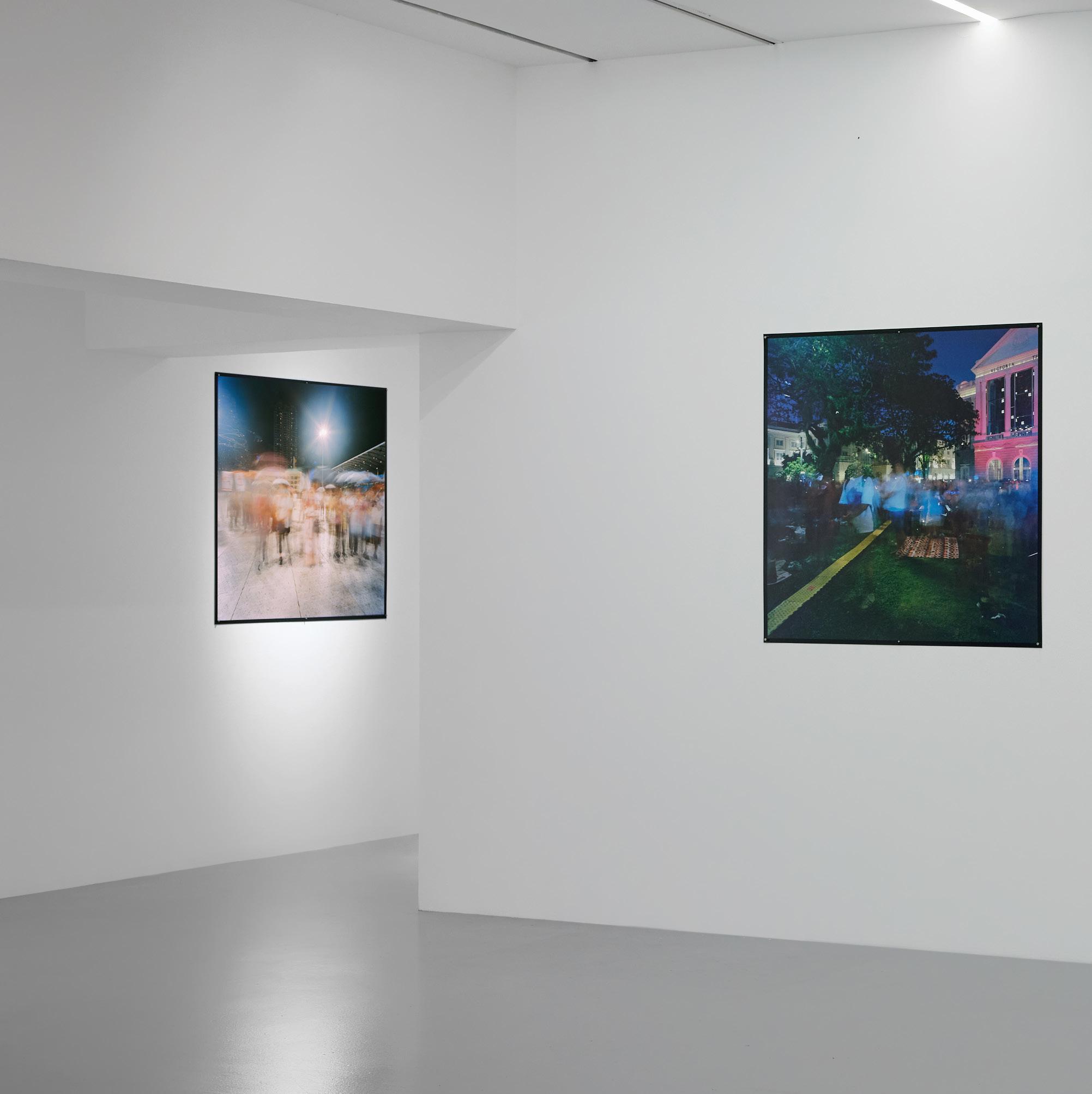 totality of the crowd from a distance on the thirteenth floor of a nearby building, Chang’s approach to the crowds in four of the works in this exhibition from The Temporary We — Tampines Ave 9, Singapore #1 (April 26, 2025), Bedok North Street 2, Singapore #3 (April 29, 2025), Bishan Street 14, Singapore #2 (April 30, 2025), and Bishan Street 14, Singapore #5 (April 30, 2025) — was to embrace them head-on, joining the ranks of the throngs of attendees herself. Where Alex’s fictive image fixes a singular moment in a snapshot that ends up defining the crowd at the rally and the election, Chang’s works allow for the vagaries of time and the emergence of alternative interpretations. The images in The Temporary We are not snapshots, but long exposures that last for the duration of an activity, which in the case of the aforementioned four works, are speeches at a rally. She thus denies the viewer a neat summary of the people present, instead suggesting individual differences beneath the appearance of collectivity. “The space between people is a medium in itself, shaped by perception and intention…I notice the closeness and the gaps, the tension between connection and separation. I cannot fully access the inner world of another, but I can feel its weight beside me,” the artist observed.