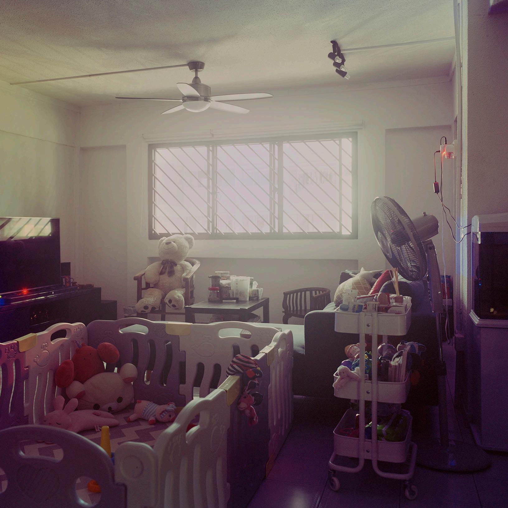 3 The social not only constitutes an important aspect in Chang’s creative process, and in the production of meaning and interpretation of her work, it also often figures as subject matter. Each work in the Silent Knight series is in fact a portrait, where sitters, despite not being physically visible in the photograph, make their presence felt through the everyday spaces they inhabit. The material traces they leave behind hint at their different personalities, interests and routines. In Silent Knight #03-573 (2018) for example, the playpen that occupies the foreground and the array of toys distributed around the room suggest at once the joys and challenges of raising young children, while in Silent Knight #150 (2019), the volumes of books and framed prints set against a luminous backdrop of light streaming through the windows from the street outside point to a passion for art. Chang never fails to emphasise to participants the importance of leaving the spaces untouched, without cleaning or posing for the camera. The authenticity