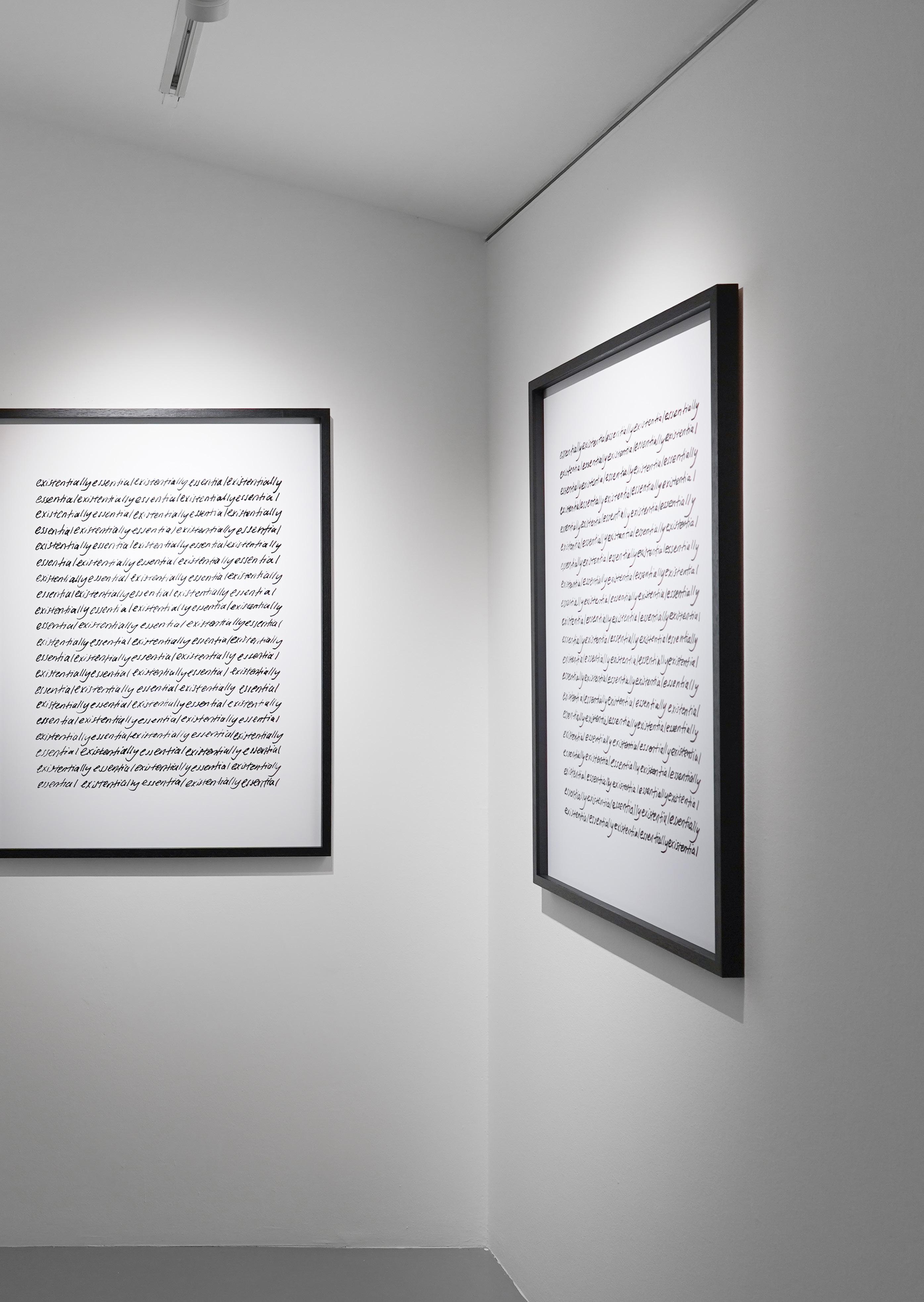 Essential and Essentially Existential articulate a reversible proposition that withholds semantic confinements, refusing both guarantee and arbitrariness. Nonessential Existence Existing Essentially, a durational writing performance, extends this refusal: iterative inscription tends towards opacity, demonstrating that accumulation does not equal understanding.