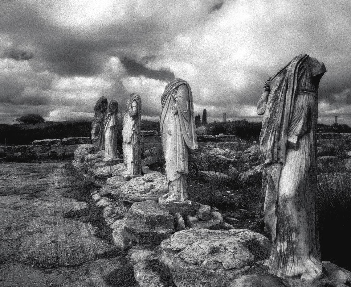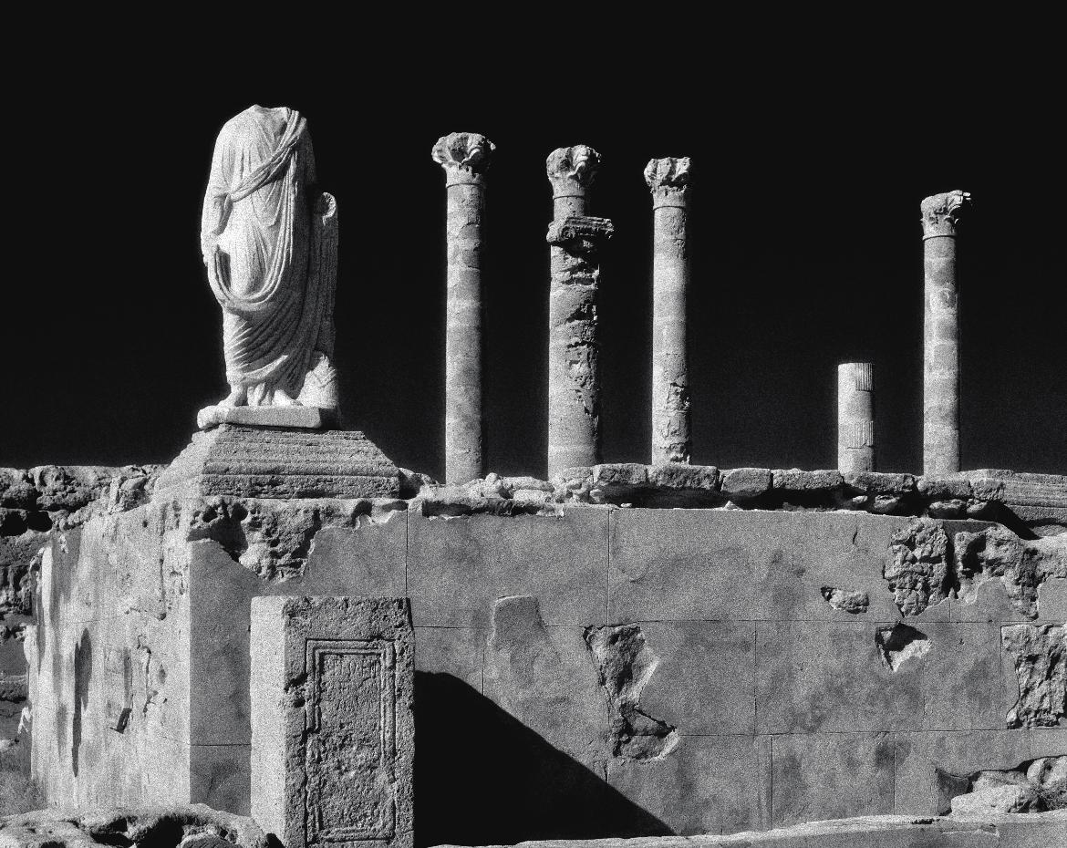“soffio”, cioè un momento, una durata, che il fotografo riesce a catturare negli scatti governati dalle cromie del bianco e nero, in un silenzio quasi metafisico nel quale sono le forme a parlare e a restituire il senso dell’armonia. Altri complessi monumentali sottratti alla sabbia del deserto vengono catturati dal maestro friulano nelle immagini che raccontano il suo viaggio del 2002 nelle terre libiche. Leptis Magna - che i cammellieri beduini chiamavano la città delle ombre bianche per la presenza di statue marmoree affioranti dalla sabbia delle dune- e poi Sabratha, Cirene, Tolemaide, Apollonia e Tripoli, sono nuove protagoniste di un racconto che narra di antichi segni di vita che si trasformano dal passato, nella storia e diventano futuro. Il suo sguardo indaga e porta a meditare e ad interrogarsi sul senso della umanità dentro la storia.
