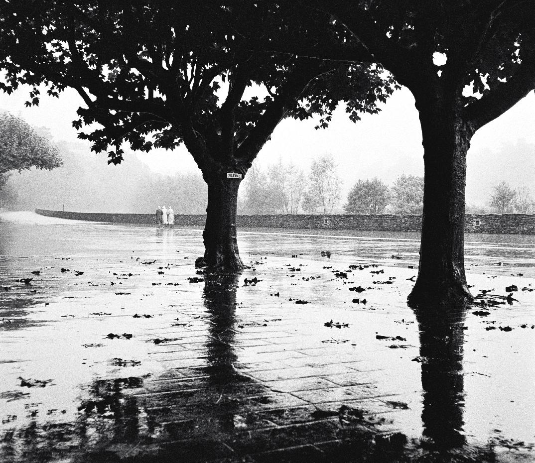 La pioggia tira a lucido l’ampio marciapiede alberato. Tre donne sullo sfondo si allontanano, rese monache dal cappuccio che si sono calate in testa contro le intemperie. Sul fusto di uno dei due alberi in primo piano è inchiodata una targhetta bianca. Impone: “silence”.