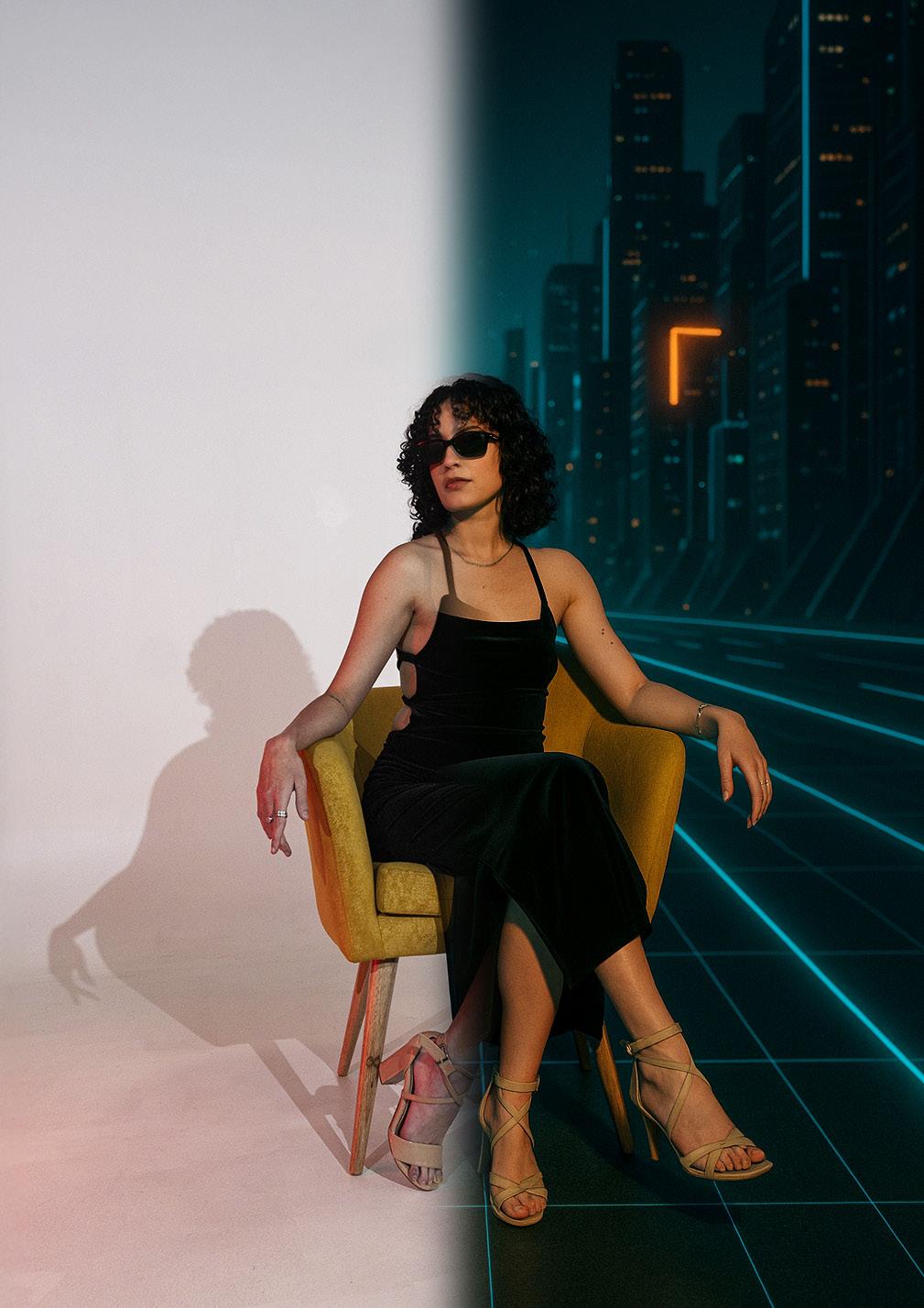 Como ya sabemos, en este proyecto Eva es nuestra imagen principal por lo cual se realizaron cuatro producciones, y cada una tiene su propia paleta cromática y estilo narrativo, pensados para mostrar diferentes etapas de su transformación. Una vez definido el concepto principal, una reinterpretación de la historia de Eva desde una mirada empoderada, libre de culpa, consciente de su decisión y en búsqueda de evolución, se planteó una narrativa visual en la que ella deja atrás el relato tradicional y se convierte en un ser actualizado, híbrido, con conocimiento propio y fuerza interior.
