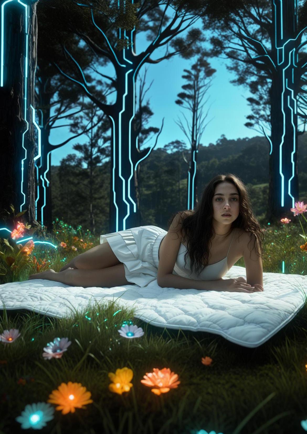 “Help me create an image of a girl, keep the same pose, the girl is 22 years old, she is dressed in a white skirt, she has a white sheet under where she stands looking like clouds on the park floor, photographic style, zenith angle, cinematic style, super realistic, mix elements of the future like flowers of the future, trees with Tron aesthetics, cinematic lighting”