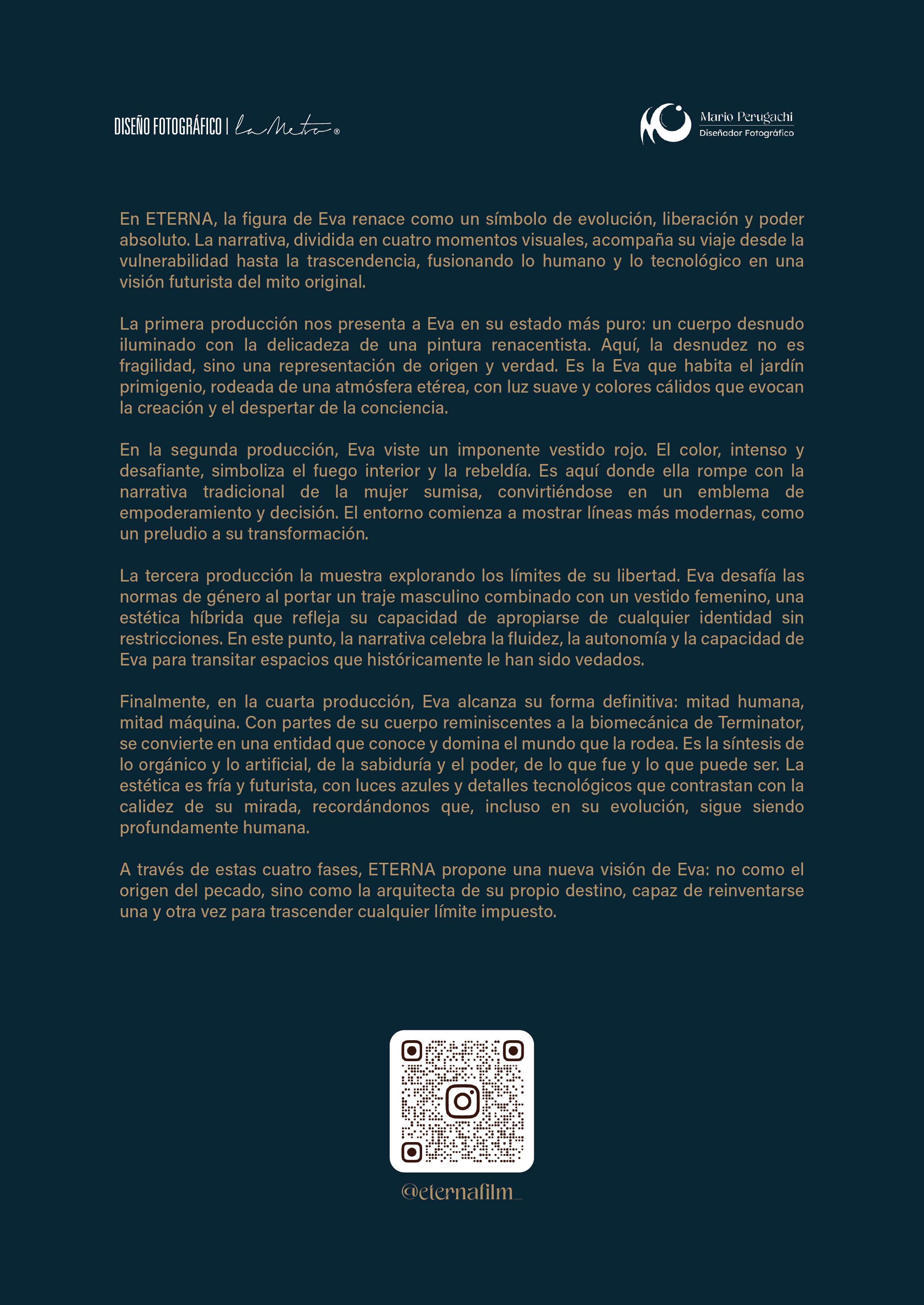 ETÉRNA es un fashion film que presenta a Eva como una figura reimaginada en el presente: ya no es la mujer del relato bíblico original, sino una versión robótica y evolucionada que representa el nuevo vínculo entre la humanidad y la tecnología.