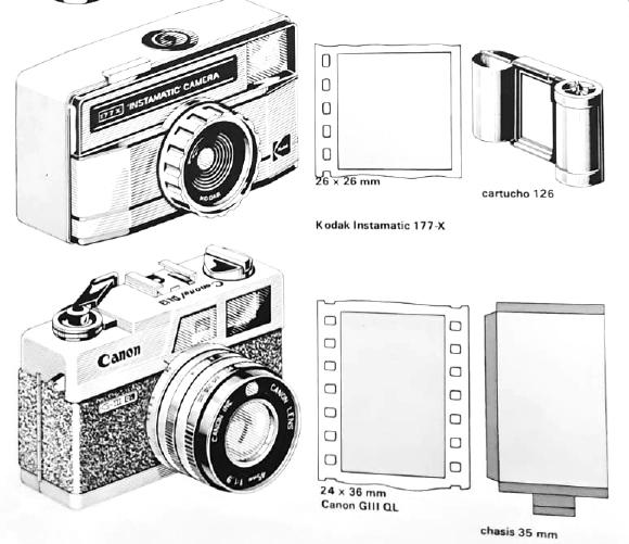 La ventaja de una cámara Kodak o Polaroid para fotografía instantánea, es que después de medioa minutos (según el tipo de películal ya puede verse copia. El formato de la misma varia, situándose torno a una media de 8 x 8 cm. Las desventajas on una calidad de copia mediocre, camaras volumino sas (aunque ligeras), películas más bien caras, in posibilidad de obtener coplas exactamente iguais sin recurrir a procedimientos especiales (esto no aplica a la Polaroid 665, que da también un negativo). La mayor parte de las cámaras son “sólidas” unas pocas plegables, más cómodas de lava dos modelos réflex de un solo objetivo. Los procesos en que no hay que despegar ni tirar nada tan obviamente más cómodos. Casi todas t ras llevan un control claroobscuro para an exposición si los resultados de la medición tica no son aceptables. Hay accesorios de acercamiento. Son las más pequeñas de las cámaras ampliamente usadas y aceptan cartuchos 110 que dan negativos de 13 x 17 mm. Son casi las cámaras más sencillas y más baratas en venta, centrándose sus ventas en el pequeño tamaño y la comodidad de carga. La desventaja básica es el pequeño formato del negativo, que hace casi imposible la obtención de buenas ampliaciones de más de 9 x 12 cm. Casi todos los modelos son de foco y exposición fijas. Algunos incorporan un flash electrónico integrado y hasta doble objetivo deslizante.