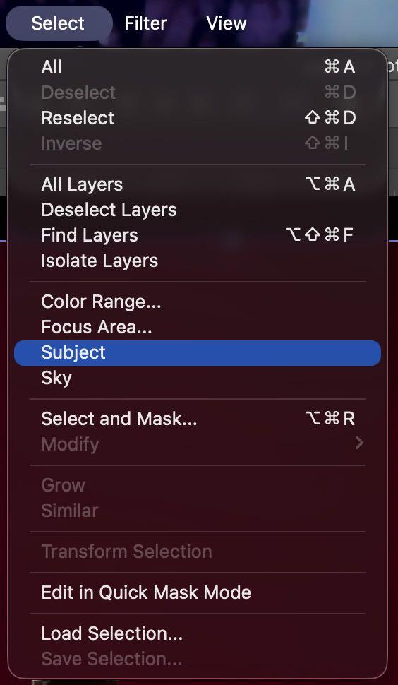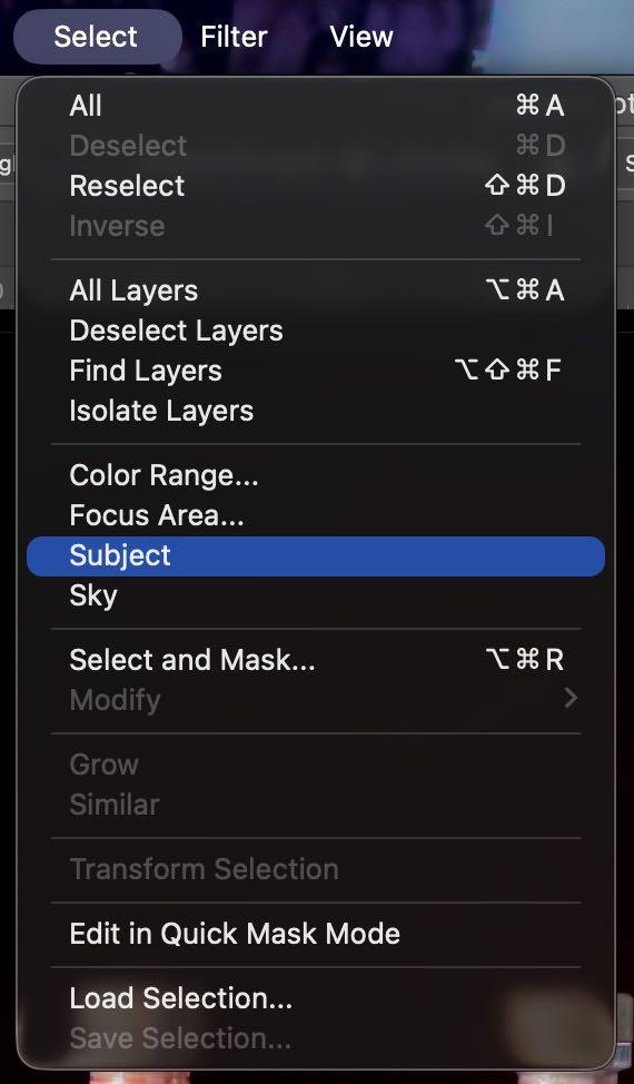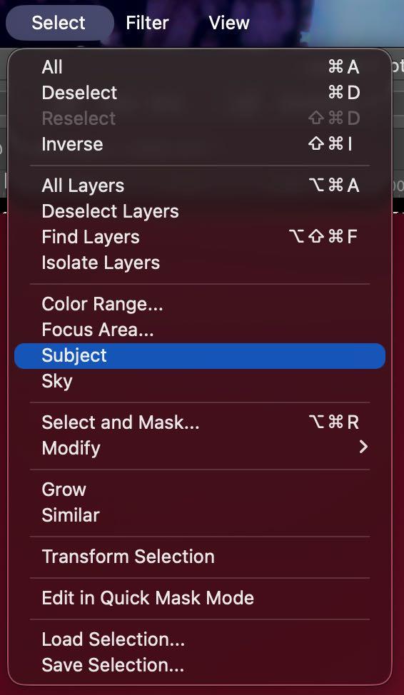 6. Al abrir photoshop, lo primero que realizamos es mejorar el fondo, así que vamos a la ventana de seleccionar > sujeto. Teniendo con eso seleccionado los objetos, y con el comando Ctrl/Cmd + I invertimos la selección para obtener el fondo.