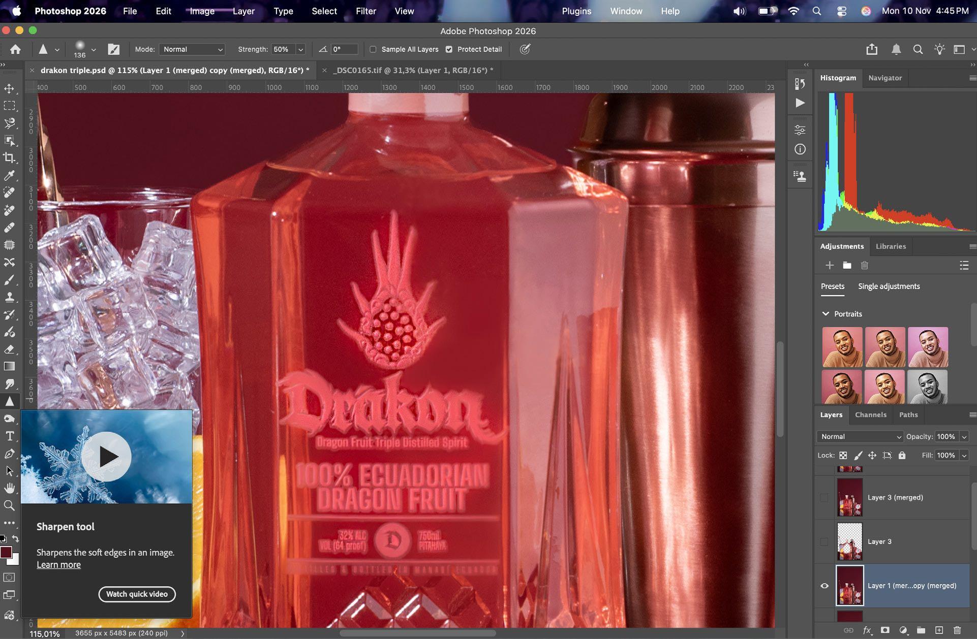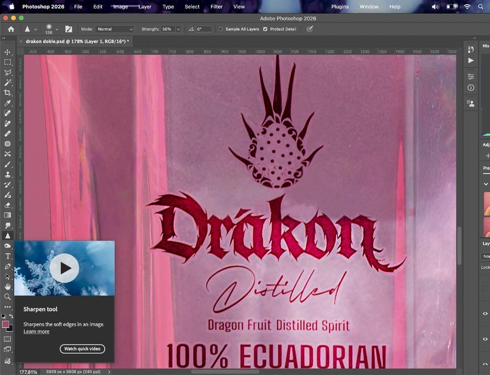 9. Con la herramienta Enfocar vamos a realzar más la etiqueta de la marca para realzarla y diferenciarla más del color de la botella, además de darle más detalle.