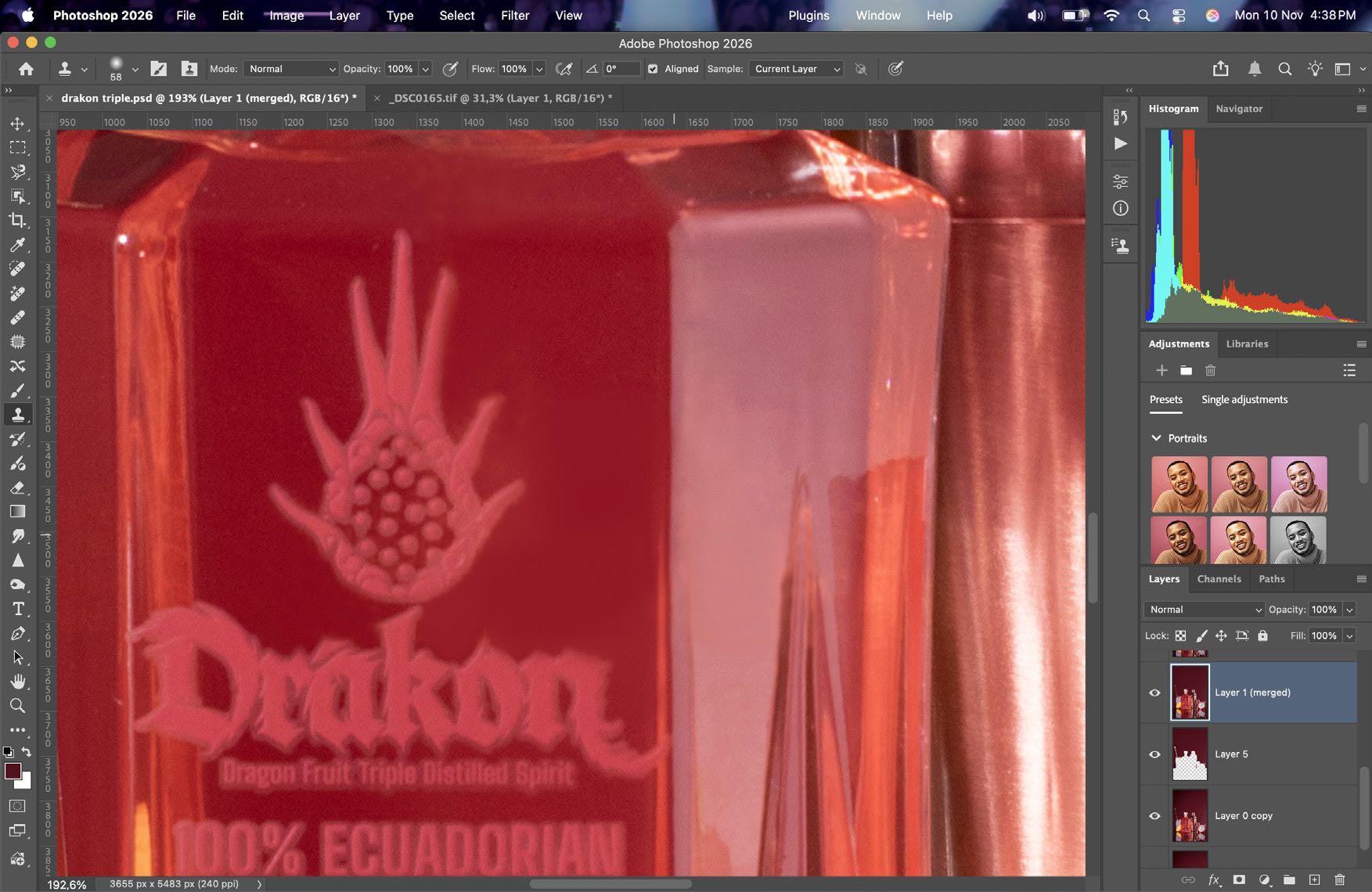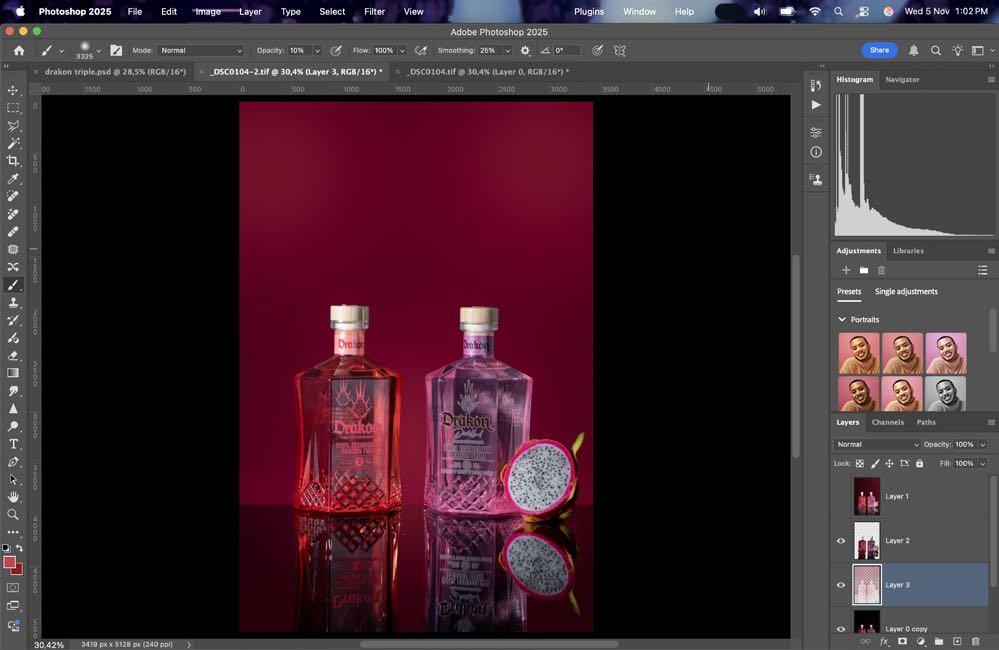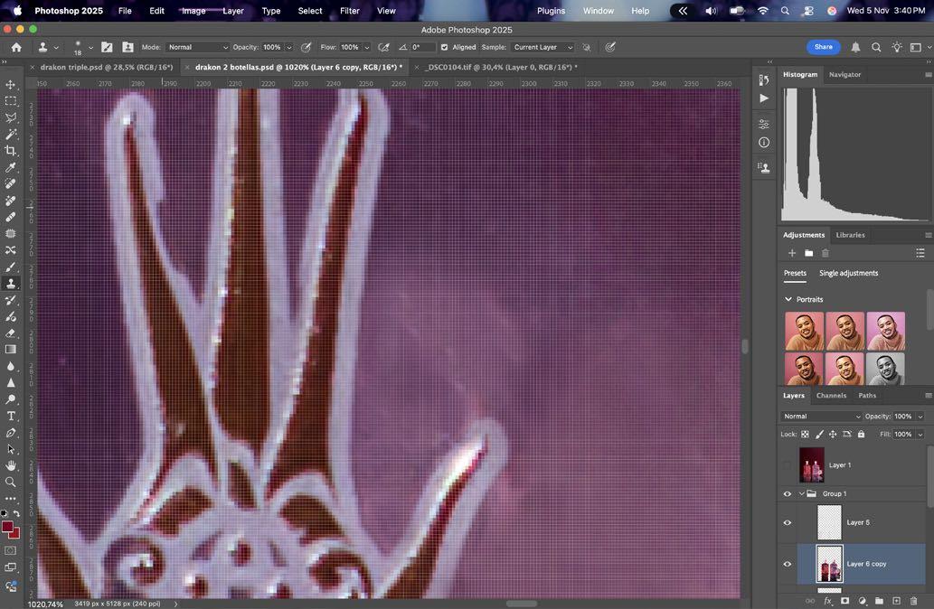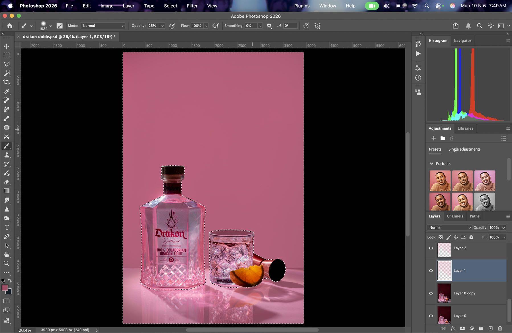 En post-producción clona gotas para pulir y darle últimos toques a la fotografía final.
