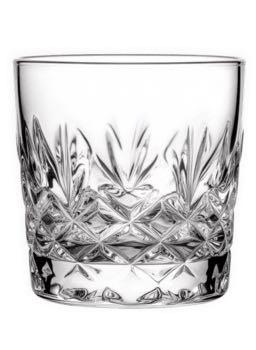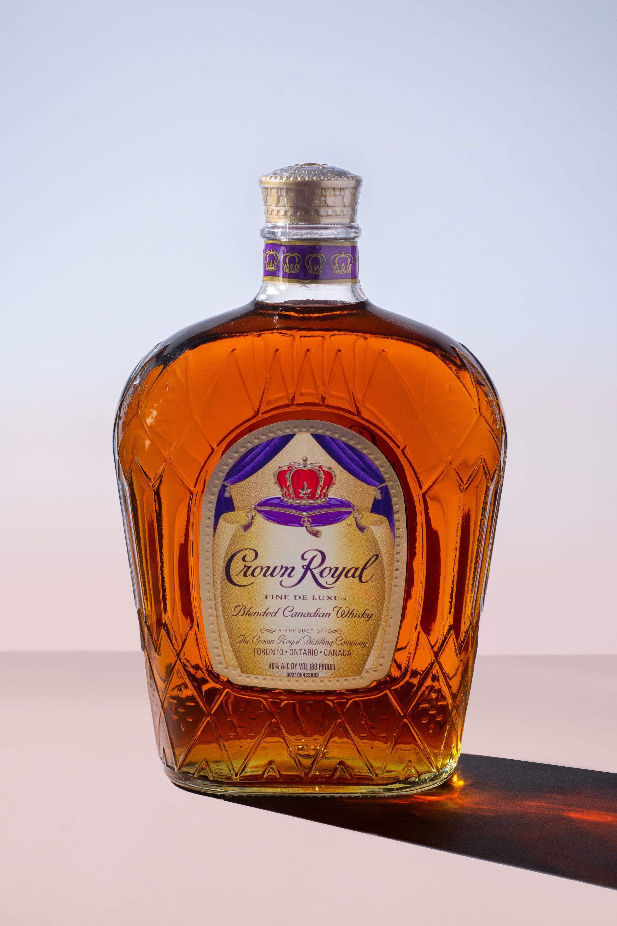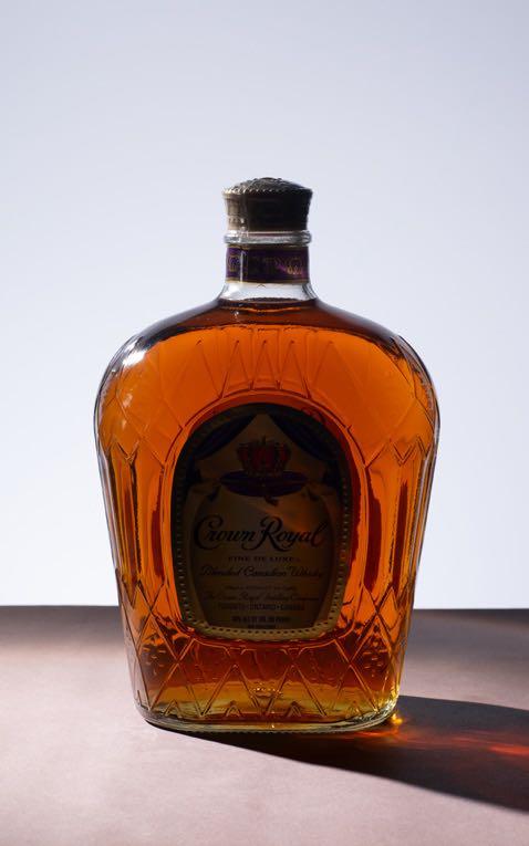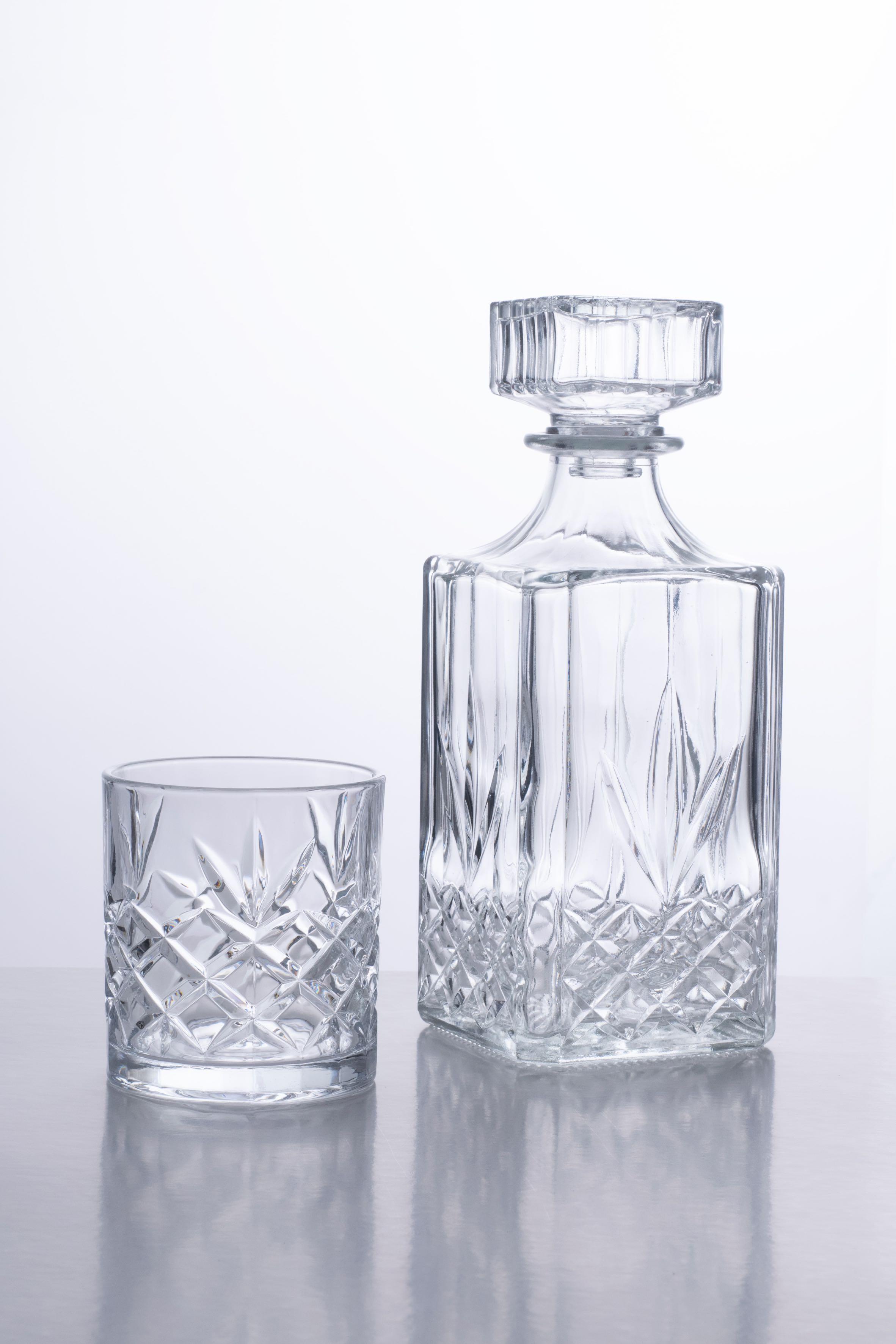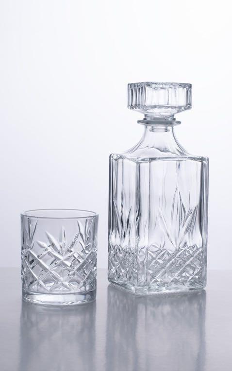 Botella cuadrada de whiskey, fondo blanco.