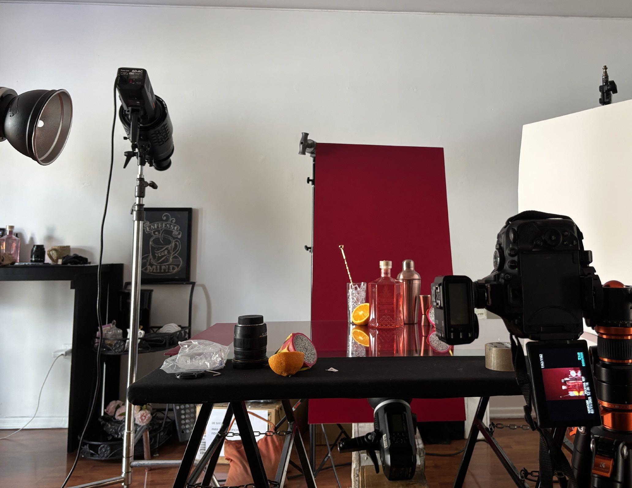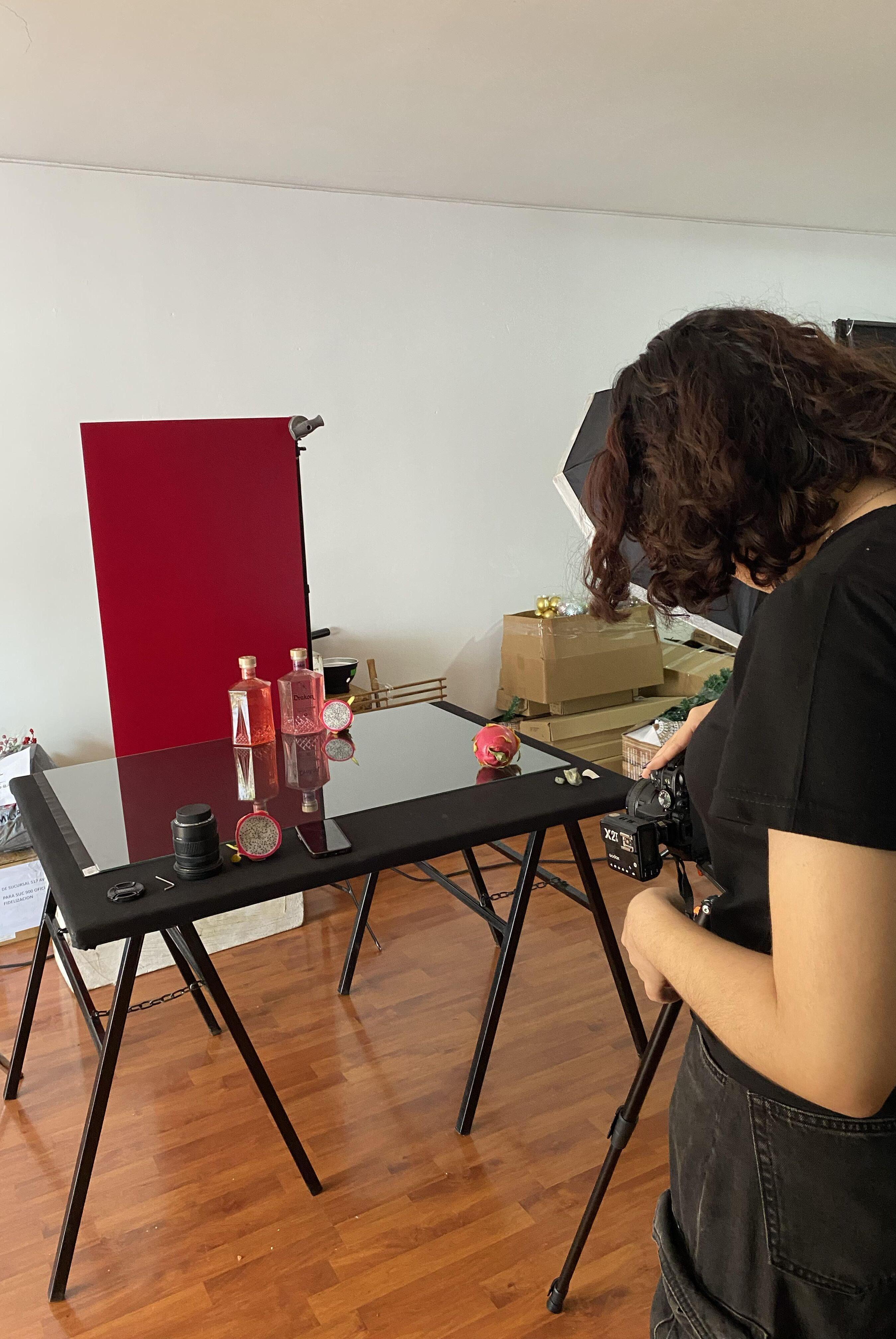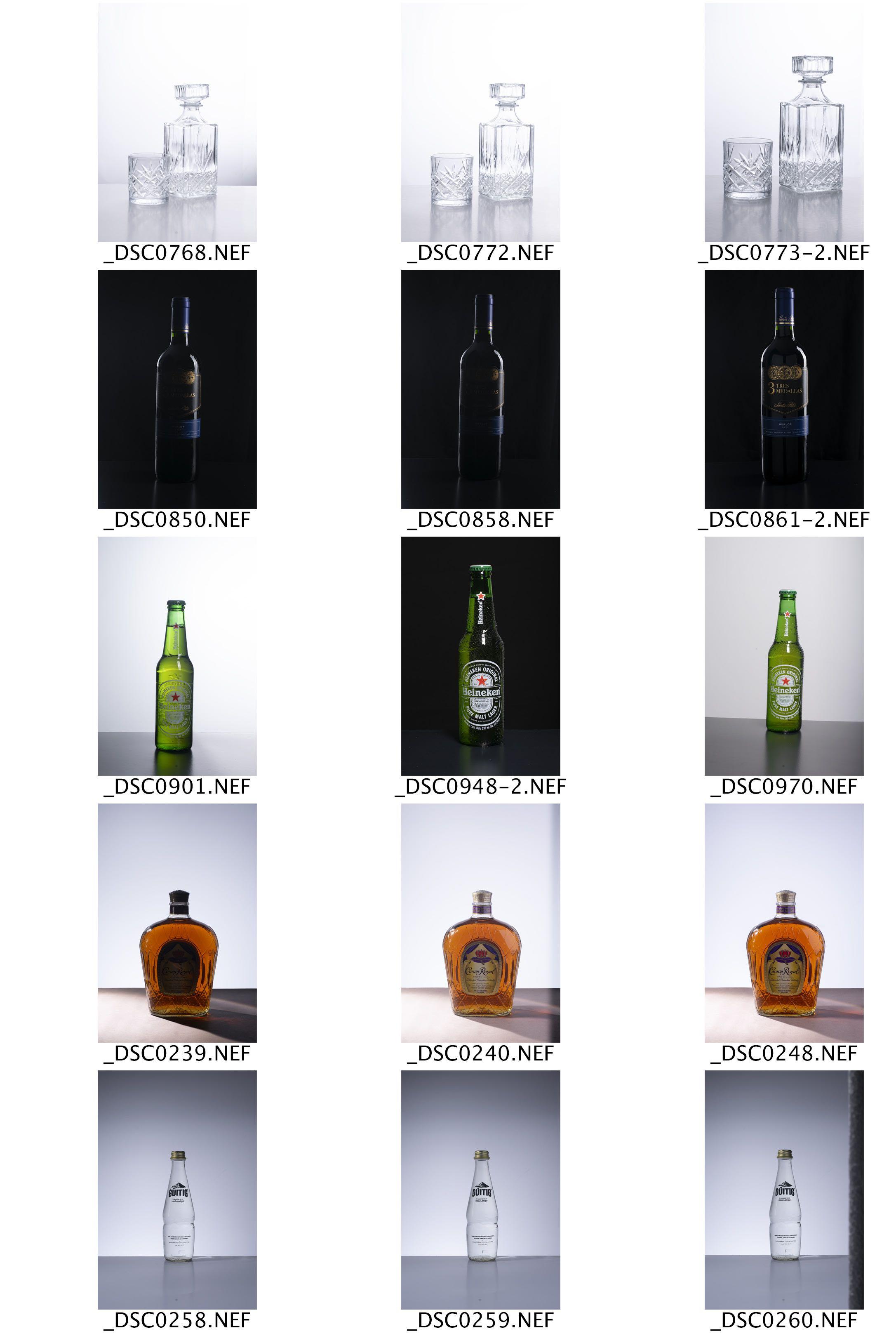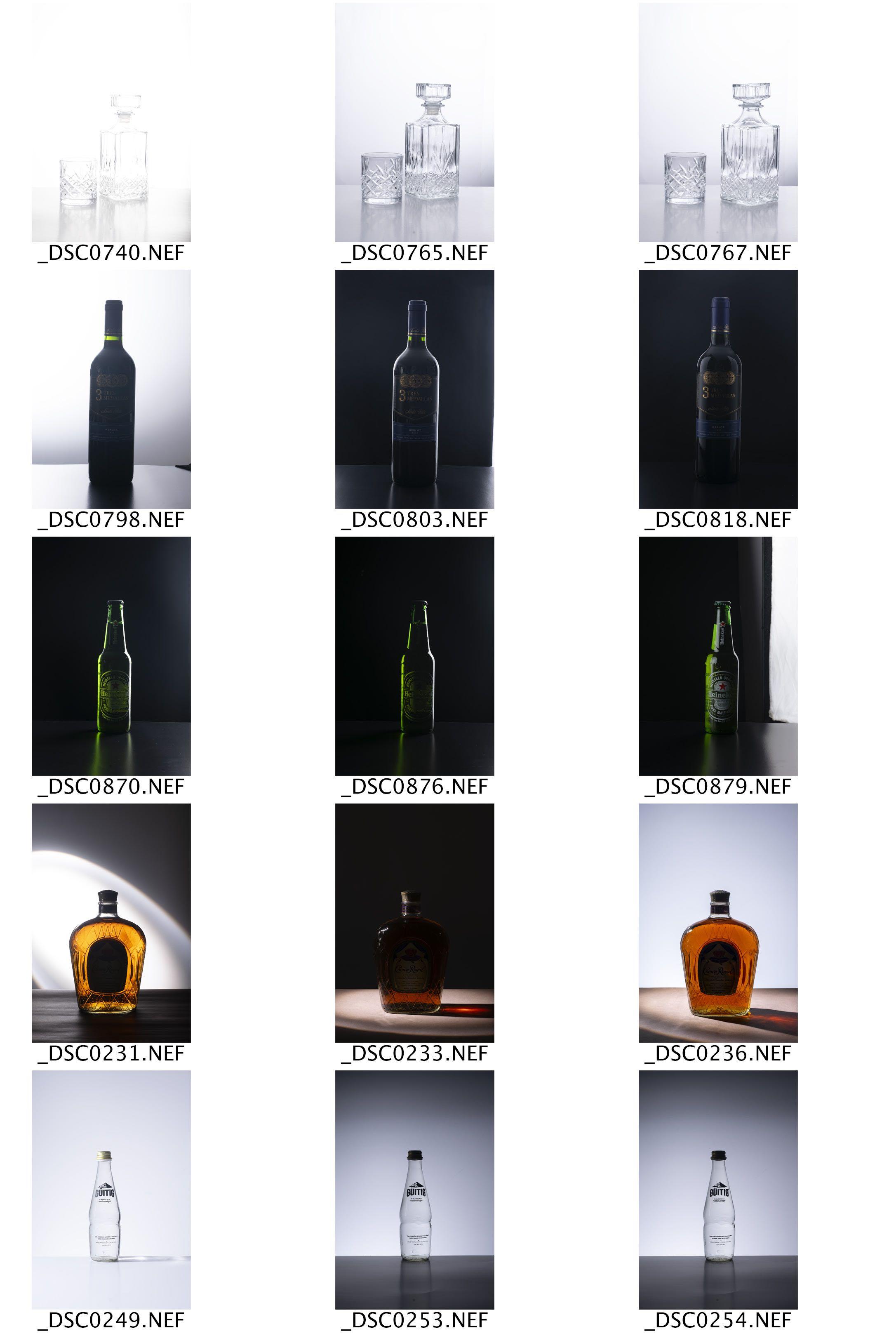 Hicimos algunos ejercicios para probar varios esquemas lumínicos, botellas y fondos.