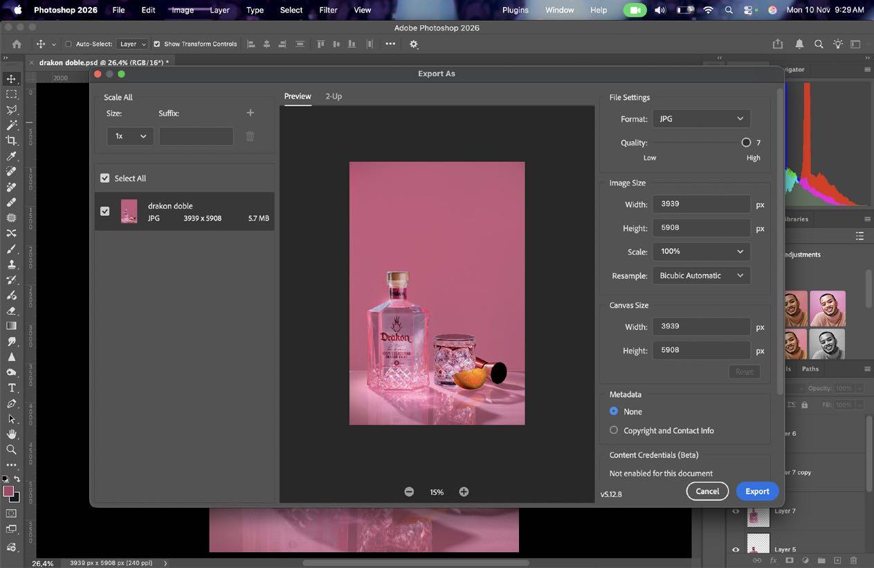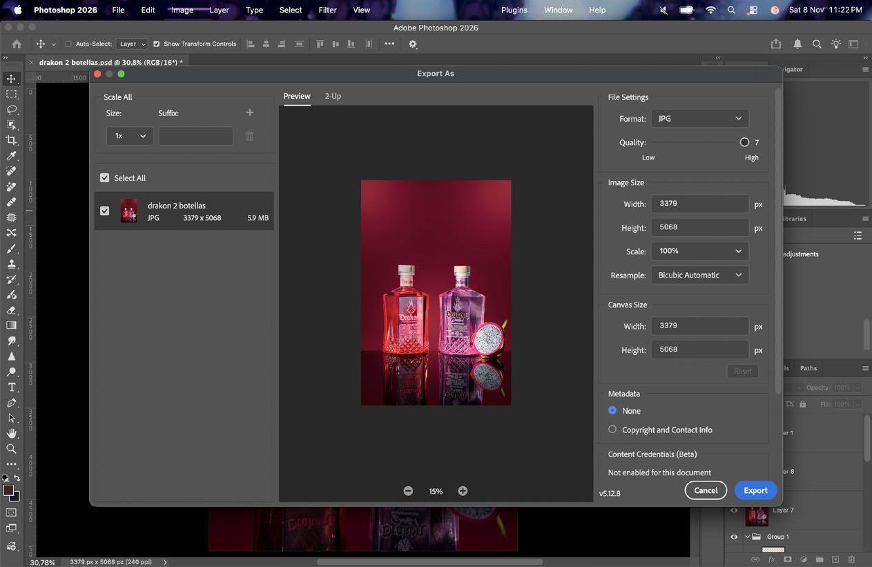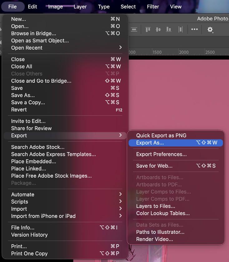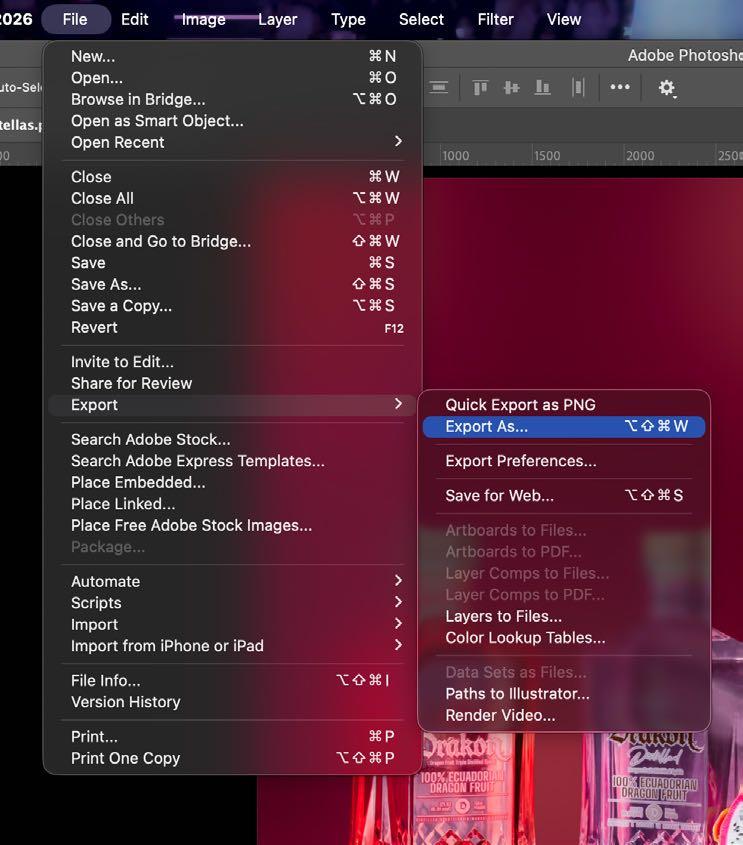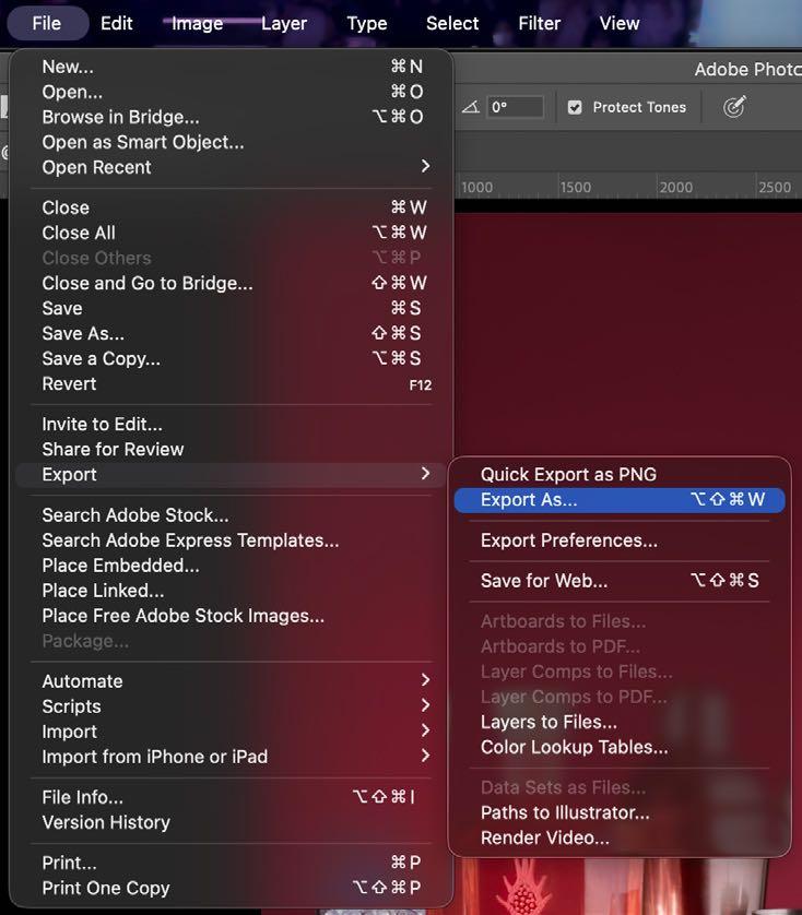11.Una vez ya terminado y revisado que no quede ningun error, exportamos nuestra imagen. Seleccionamos Archivo > Exportar > Exportar como, o usamos el comando Ctrl/Cmd + opt/alt + Shift + W y escojemos de preferencia la mayor calidad.