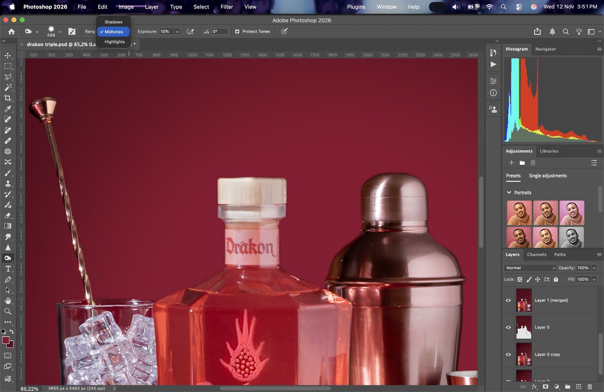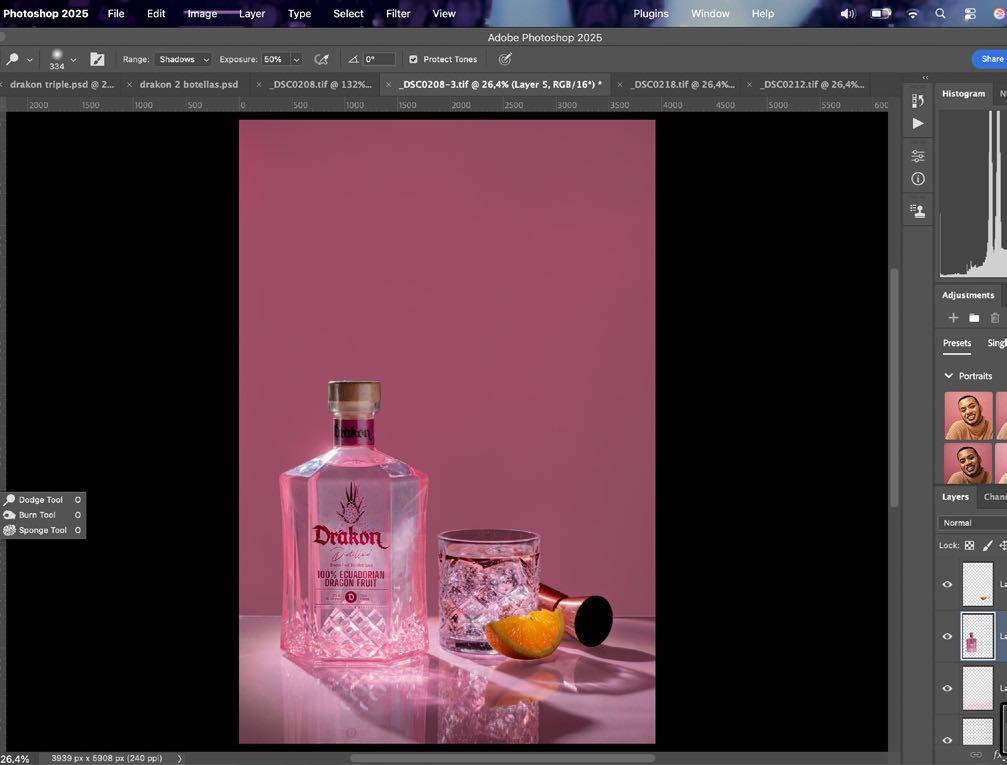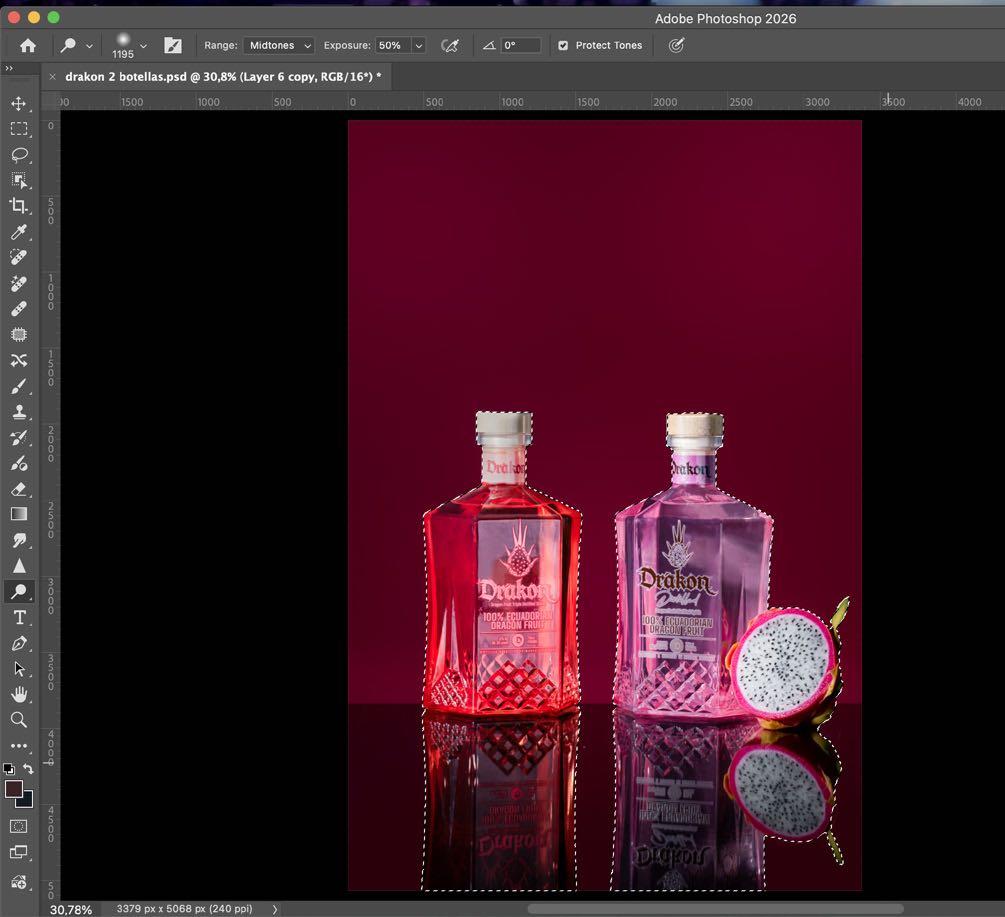 9. Con la herramienta de sobreexponer y subexponer vamos a realzar más los elementos dentro de nuestra fotografía. Usamos la herramienta de sobreexponer sobre las botellas para darle más protagonismo, y usamos subexponer para bajarle tonos a la tapa, debido a que tenían mucha luz.