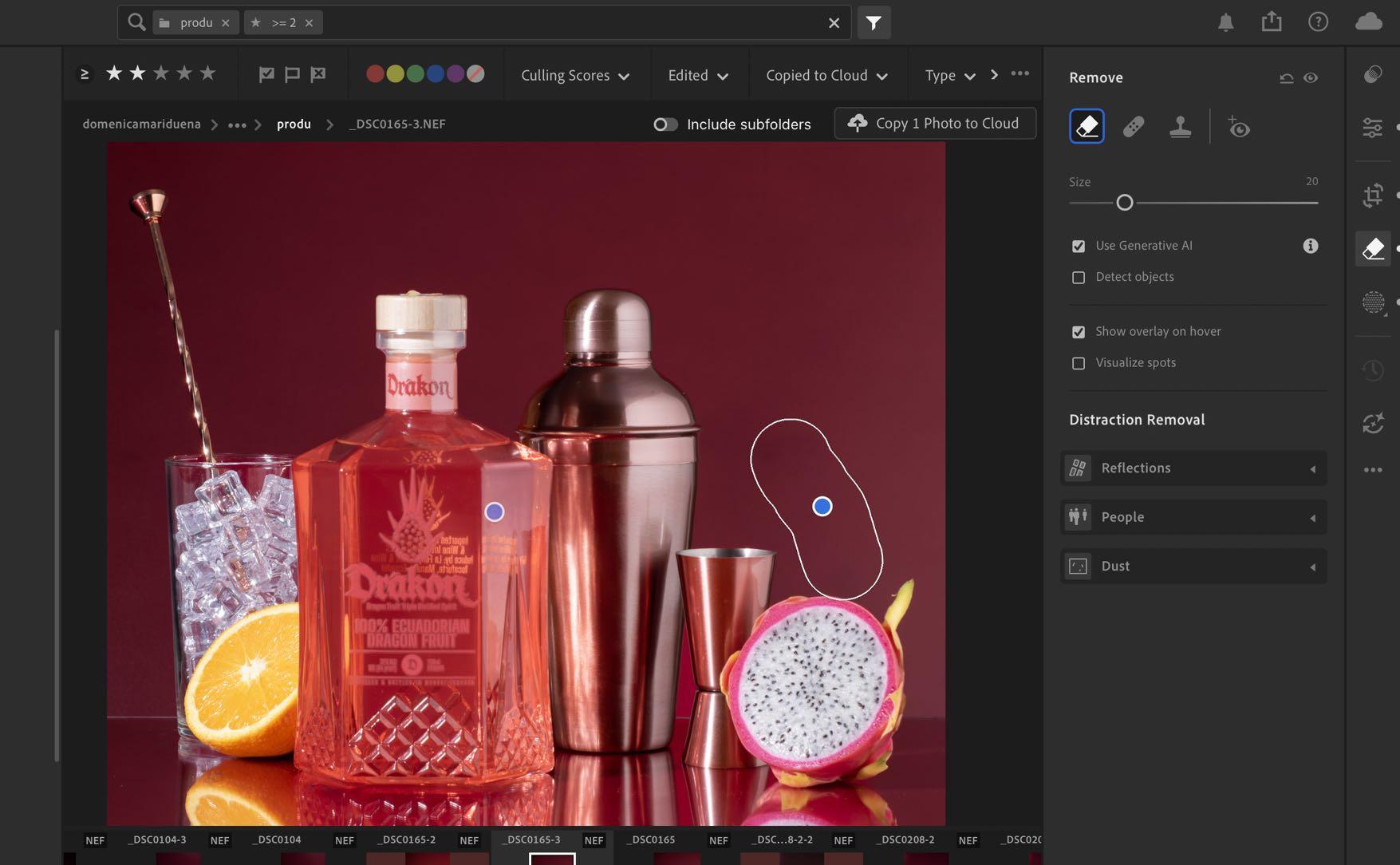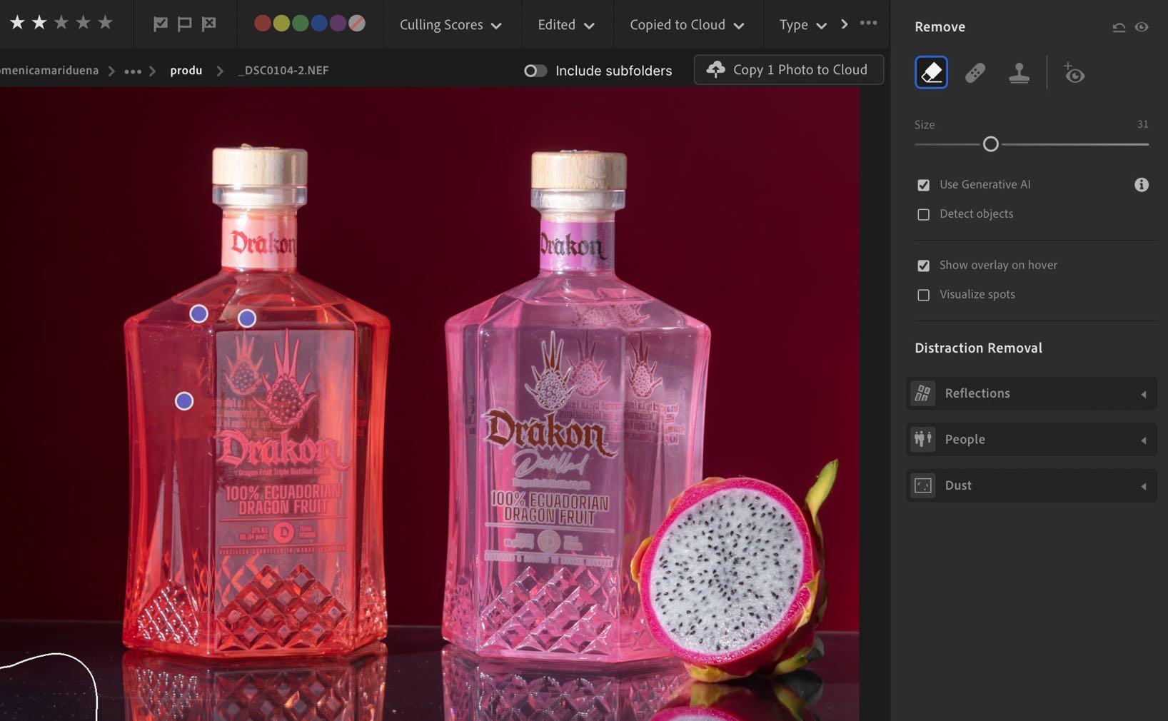 • Recordemos que la IA forma parte de la herramienta poco tiempo, así que se debe usar con precaución para no dañar nuestro producto ni fotografía en general. Los puntos azules fueron los lugares a los que pudimos darle uso en nuestra fotografía.