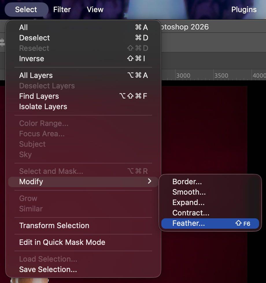 • Una vez seleccionado en cada foto usamos Shift + opt/alt + F6 para desvanecer nuestra selección y nuestros bordes se vean de manera más uniforme.
