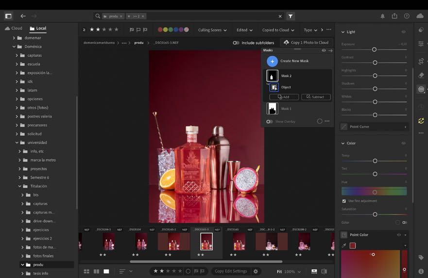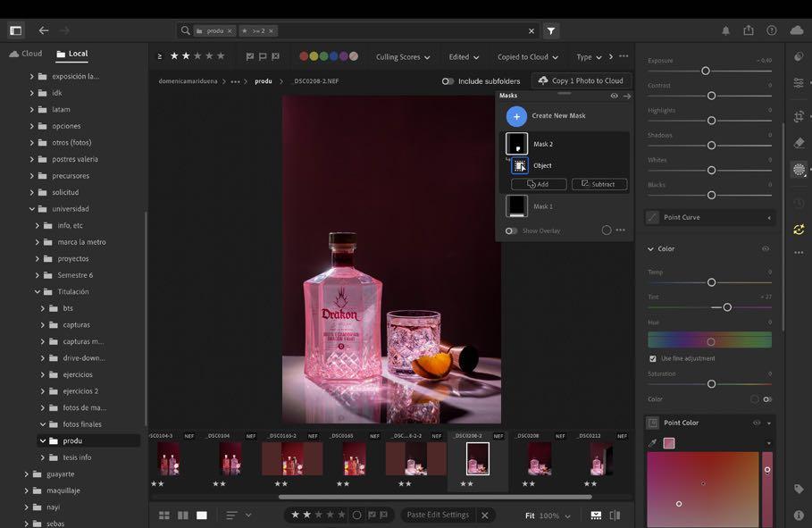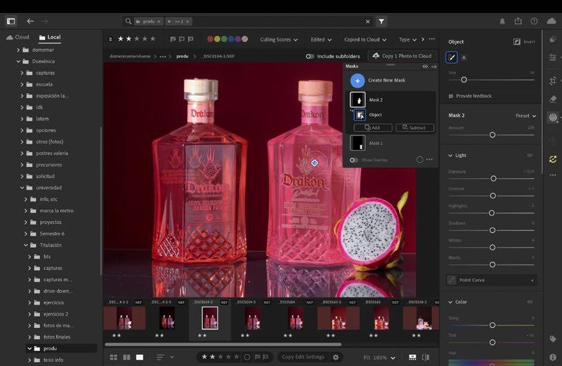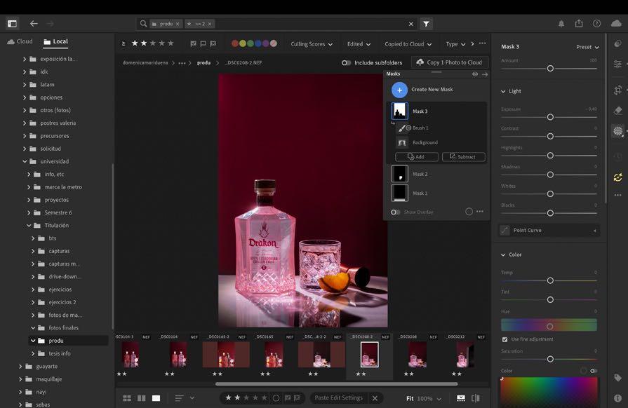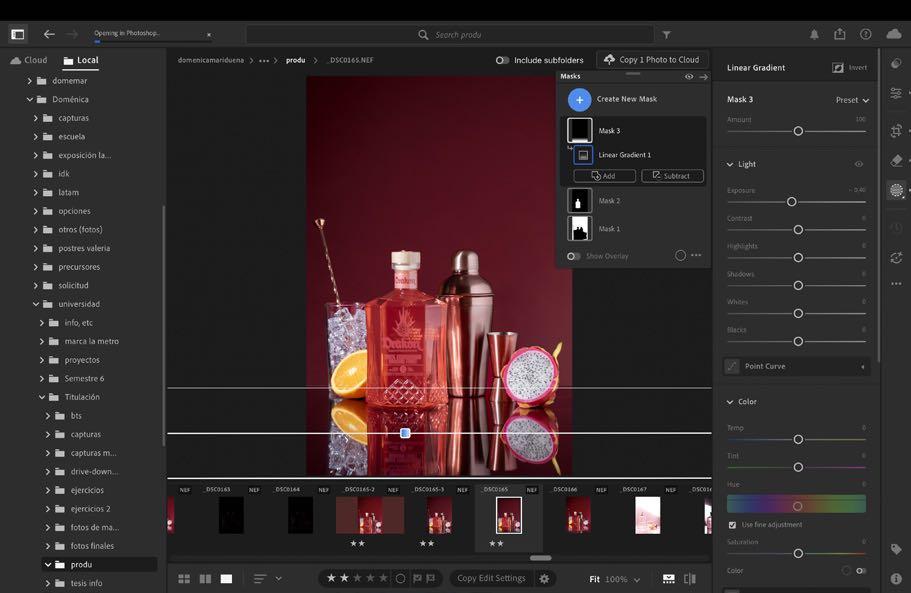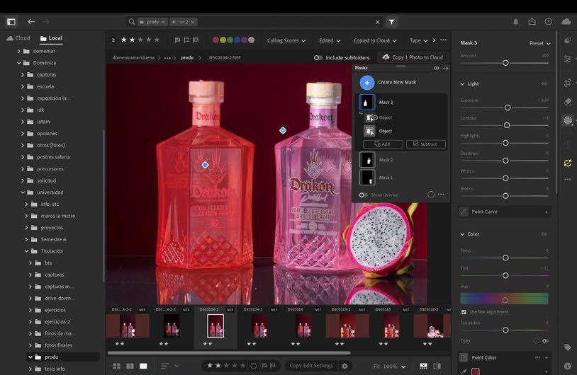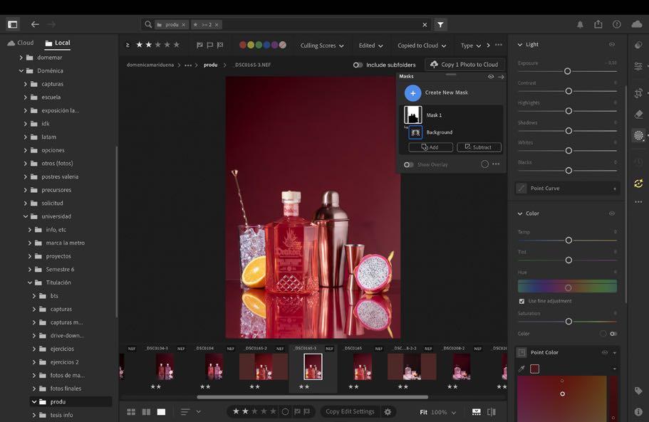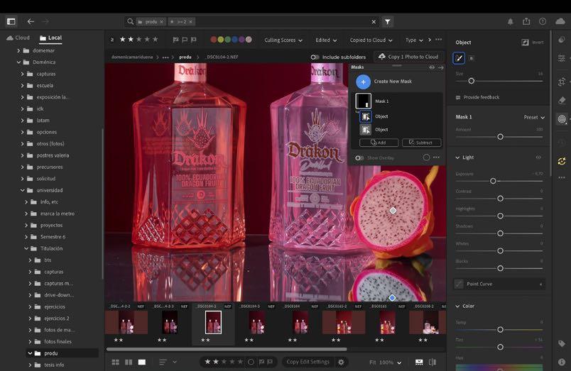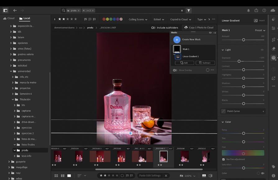 1. Al estar en nuestra fotografía escogida dentro de lightroom movemos luces y sombras sin dañar el color de la botella, solo acercarlo a su color real. Como esta imagen contiene muchos más elementos si queremos mejorar algo de algún objeto, es mejor hacerlo por separado dentro de masking más adelante.
