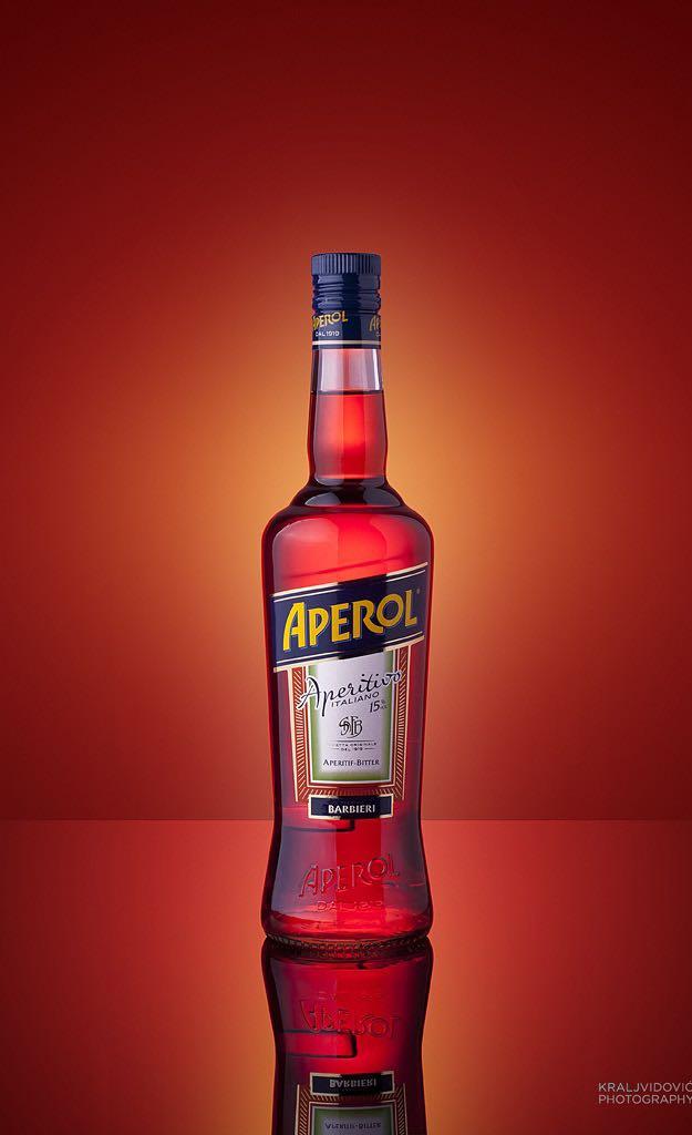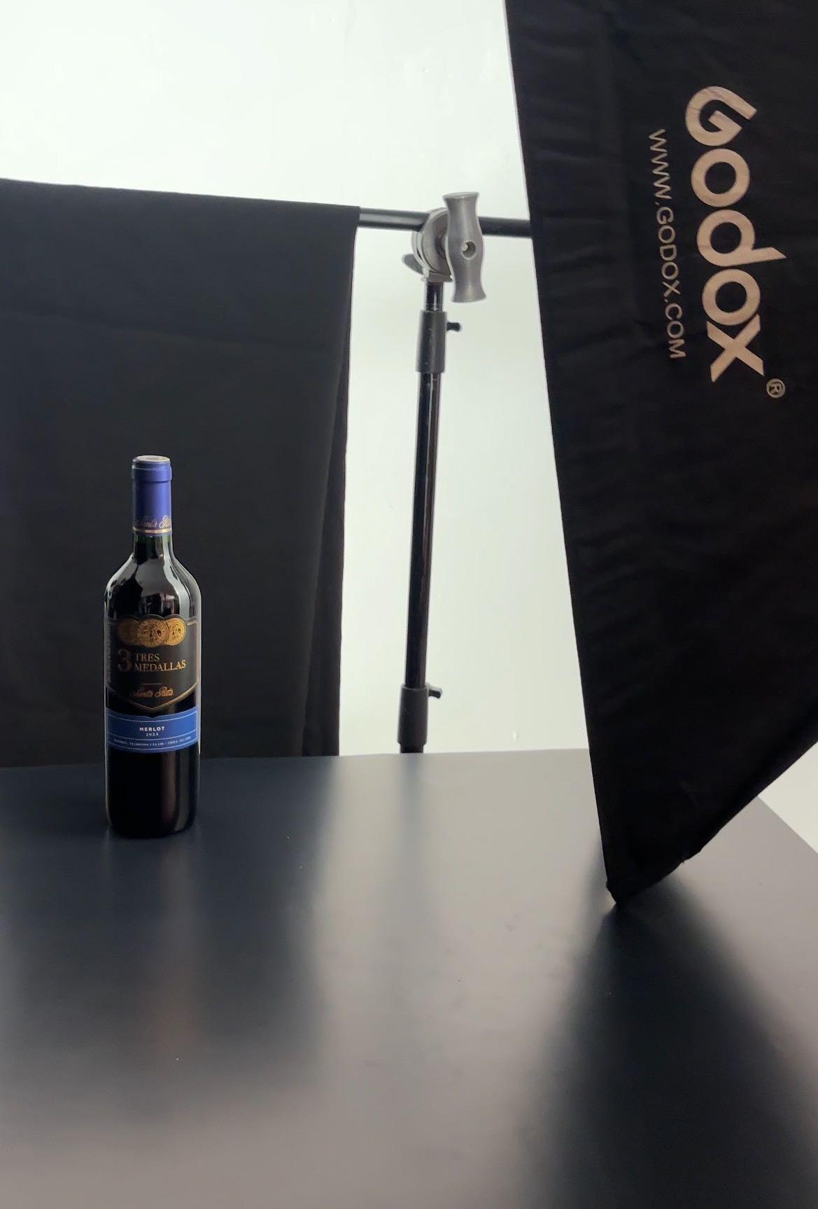 Se utiliza un contraluz para enmarcar los filos, luz lateral y rebotador de relleno para iluminar la etiqueta y la tapa.