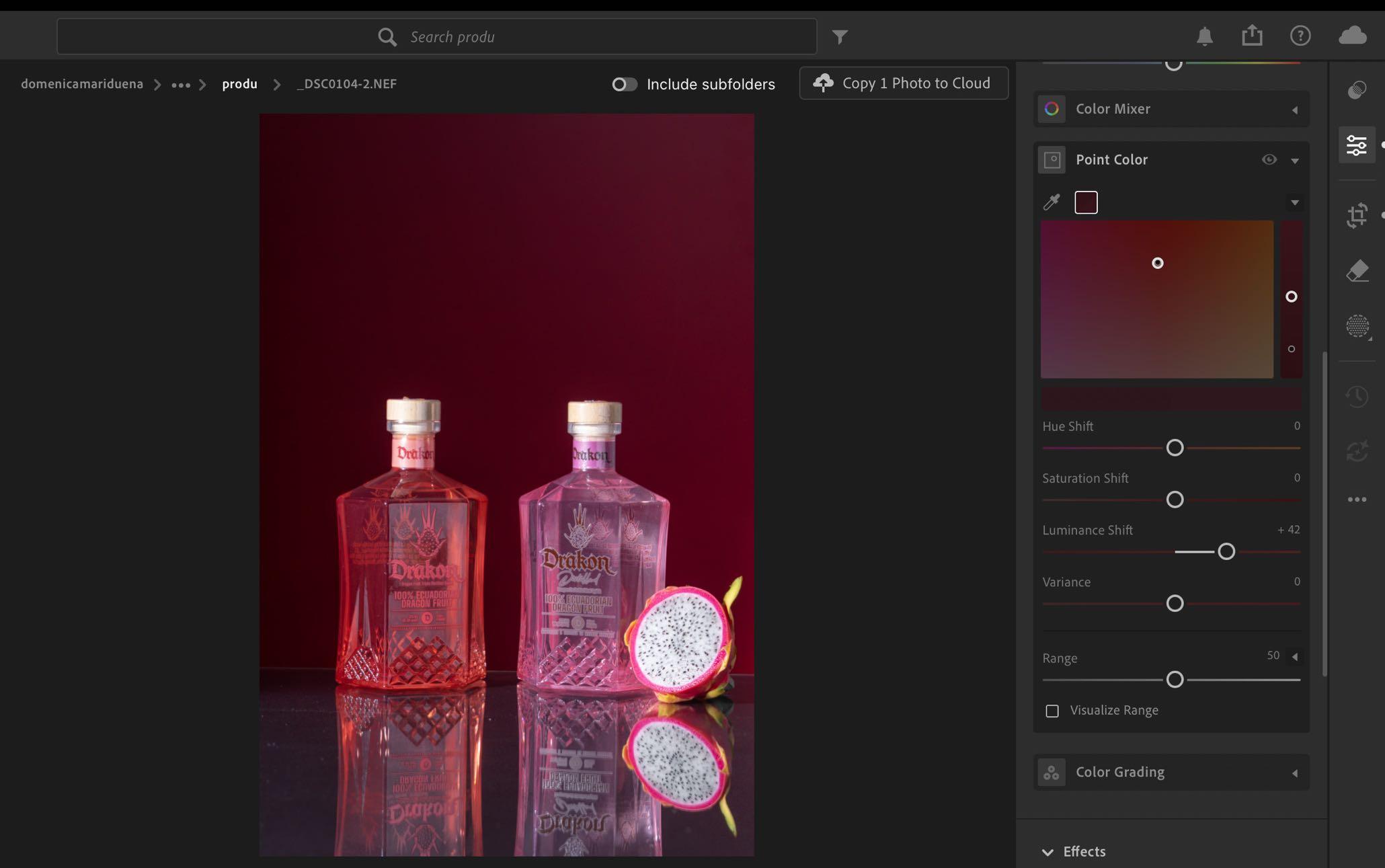 2. Otra cosa que podemos hacer es utilizar el point color para realzar algún color en específico, escoges el color con el que desees trabajar con la pipeta. Aquí escogimos el tono borgoña.