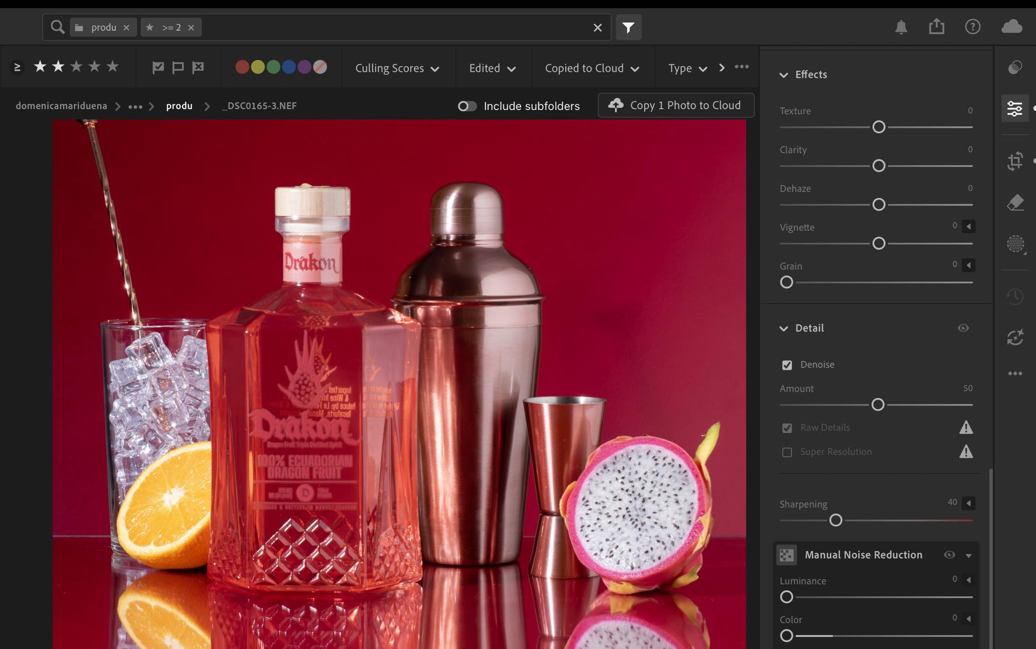 2. Otra herramienta reciente que encontramos dentro de lightroom es Reducción de Ruido, que se encuentra dentro de edit mismo, este, usa IA para ayudar a quitarle ruido a la imagen y mejorarla.