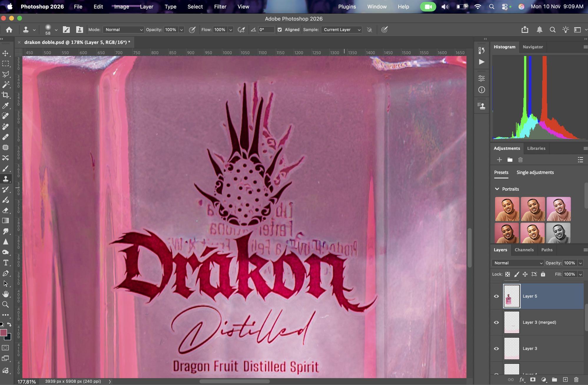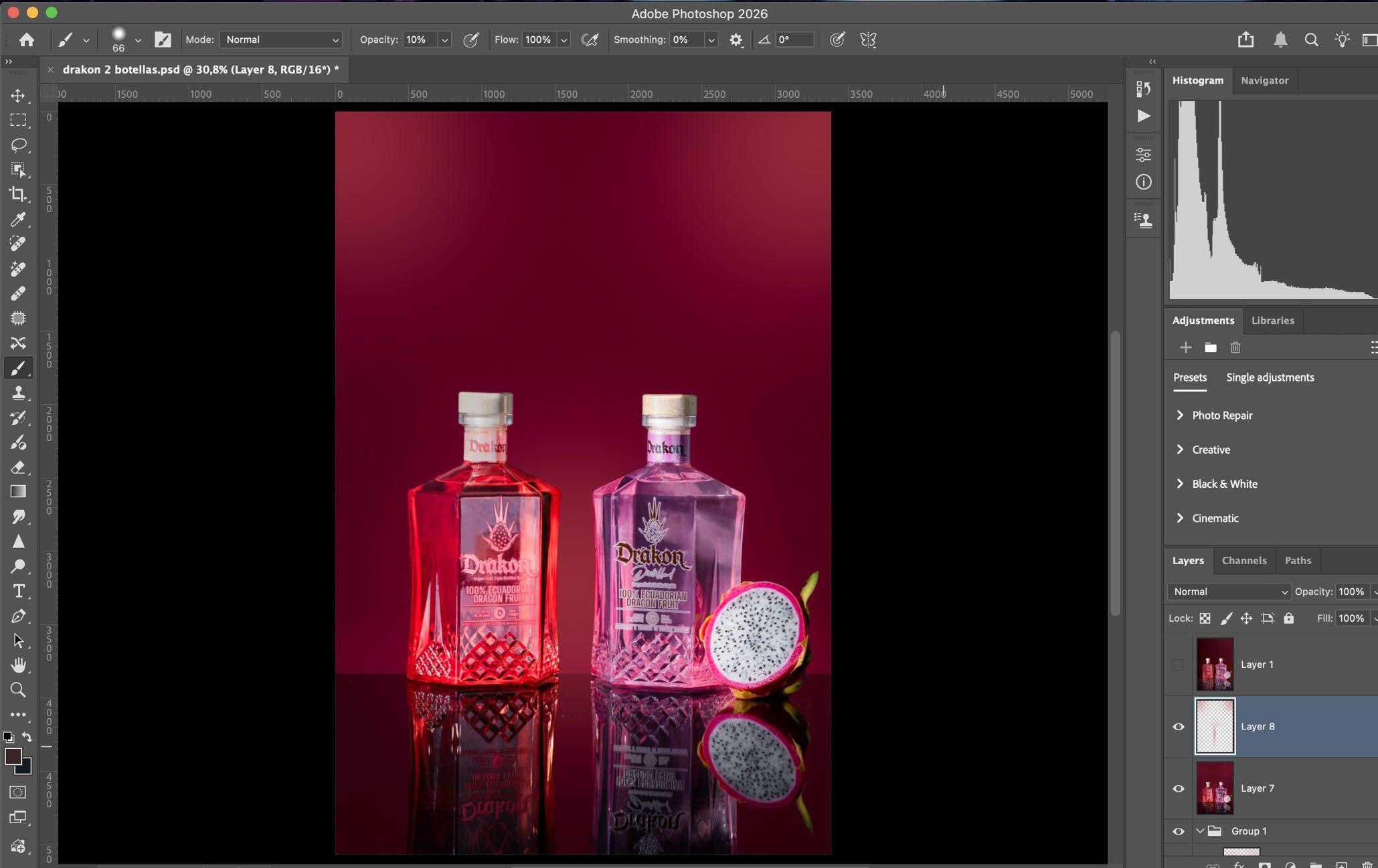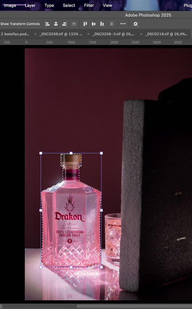 • Manejamos la botella para acercarla a su color en la realidad sin dañar el resto de objetos y realzamos su color para darle más protagonismo.