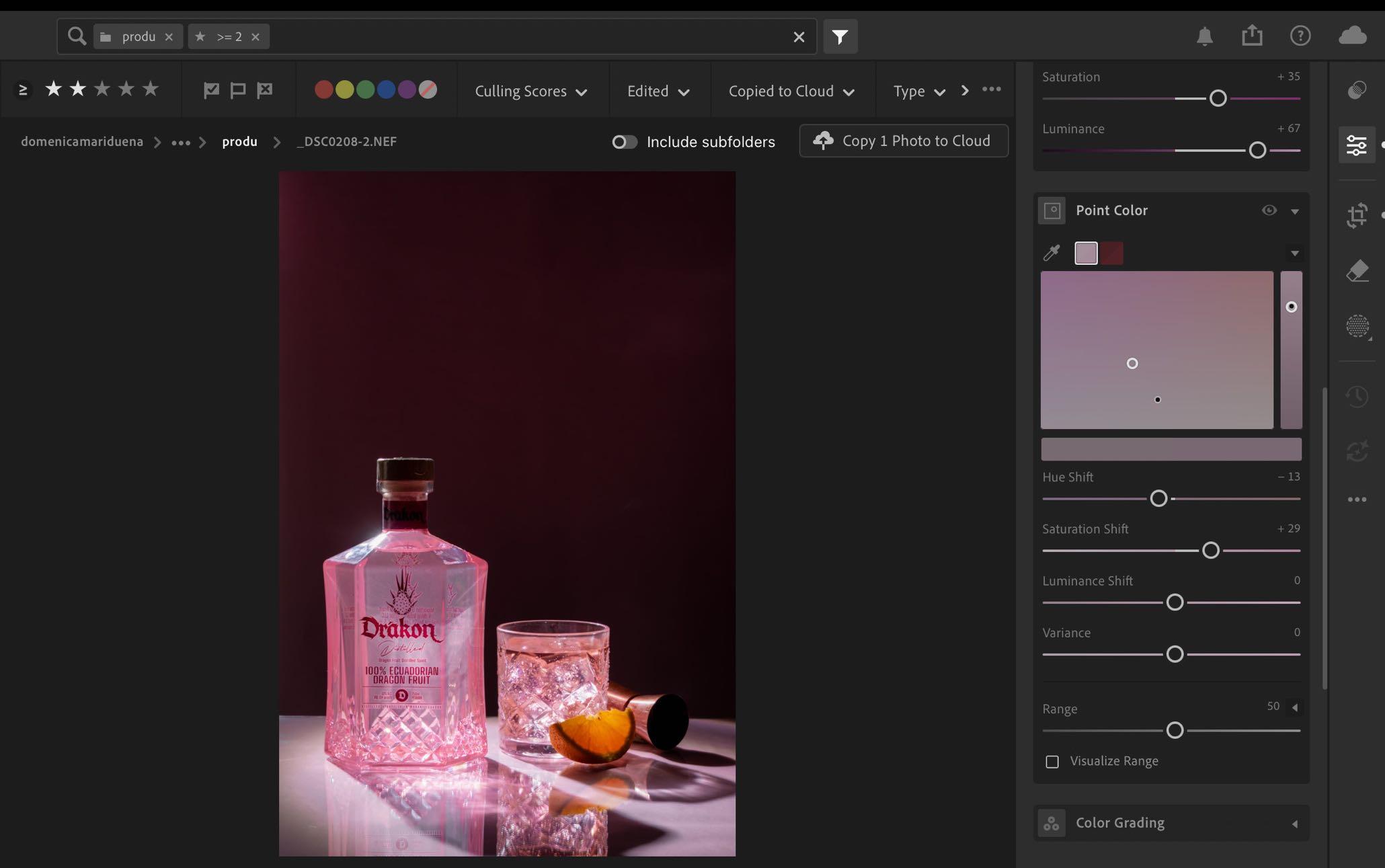 1. Al estar en nuestra fotografía escogida dentro de lightroom movemos luces y sombras sin dañar el color de la botella, solo acercarlo a su color real. Incluso dentro de color mixer al tono más cercano de lo que tenemos en nuestra imagen y realzamos su color para que se logre ver de manera más llamativa.
