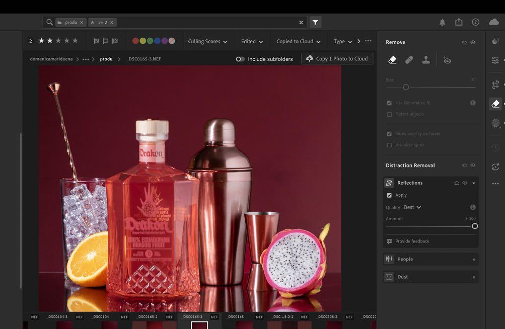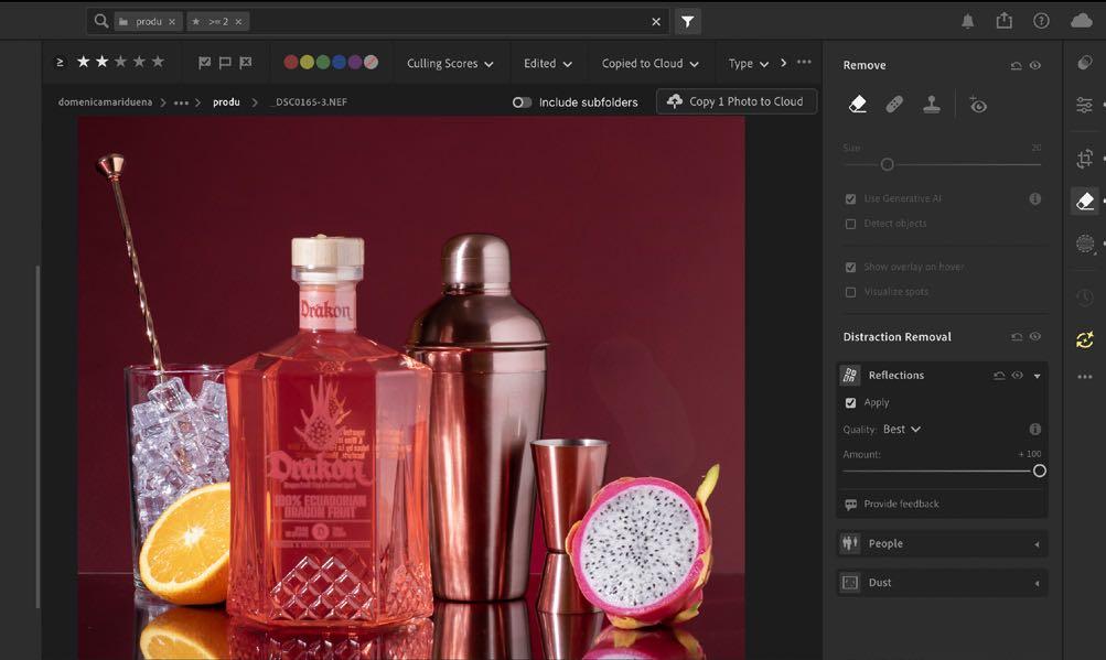 5. Por último, en lightroom, el panel de eliminación de distracciones aplicamos eliminar reflejos. Este usa IA para detectar y quitar reflejos de manera automática y mejora el color de la fotografía.