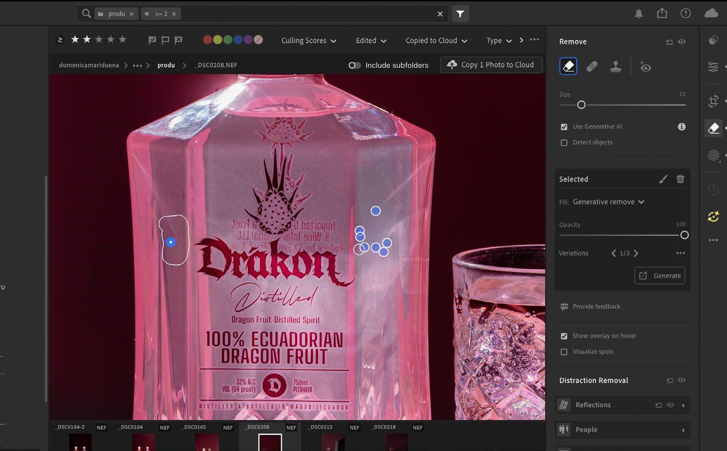 4. Ya que las botellas tienen un grabado en la parte trasera, se quitará lo posible con ayuda de inteligencia artificial en la herramienta de remove, sin dañar la parte frontal, y asegurandonos de tener el usar IA Generativa activado.