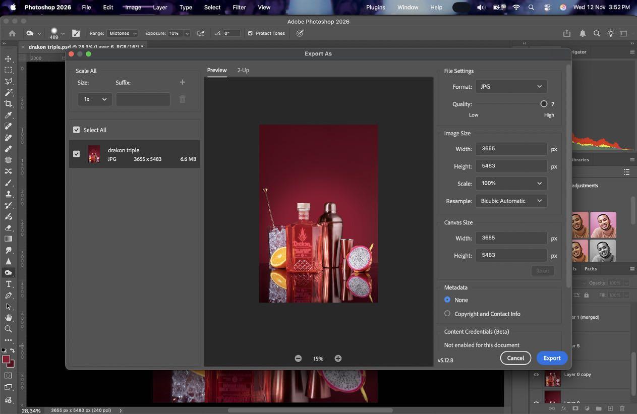 11.Una vez ya terminado y revisado que no quede ningun error, exportamos nuestra fotografía. Seleccionamos Archivo > Exportar > Exportar como, o usamos el comando Ctrl/Cmd + opt/alt + Shift + W y escojemos de preferencia la mayor calidad.