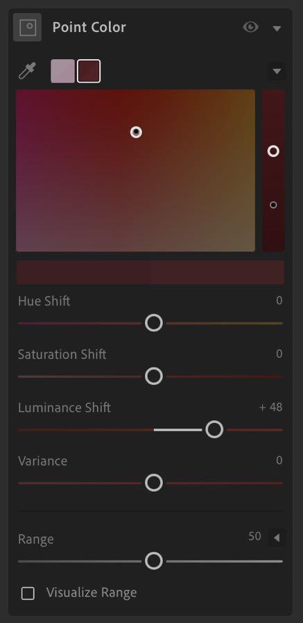 2. Para seguir realzando colores en point color escogimos 2 tonos, el rosa y borgoña y ajustamos su saturación y luminosidad. Esta herramienta te permite hacer varios swatches.