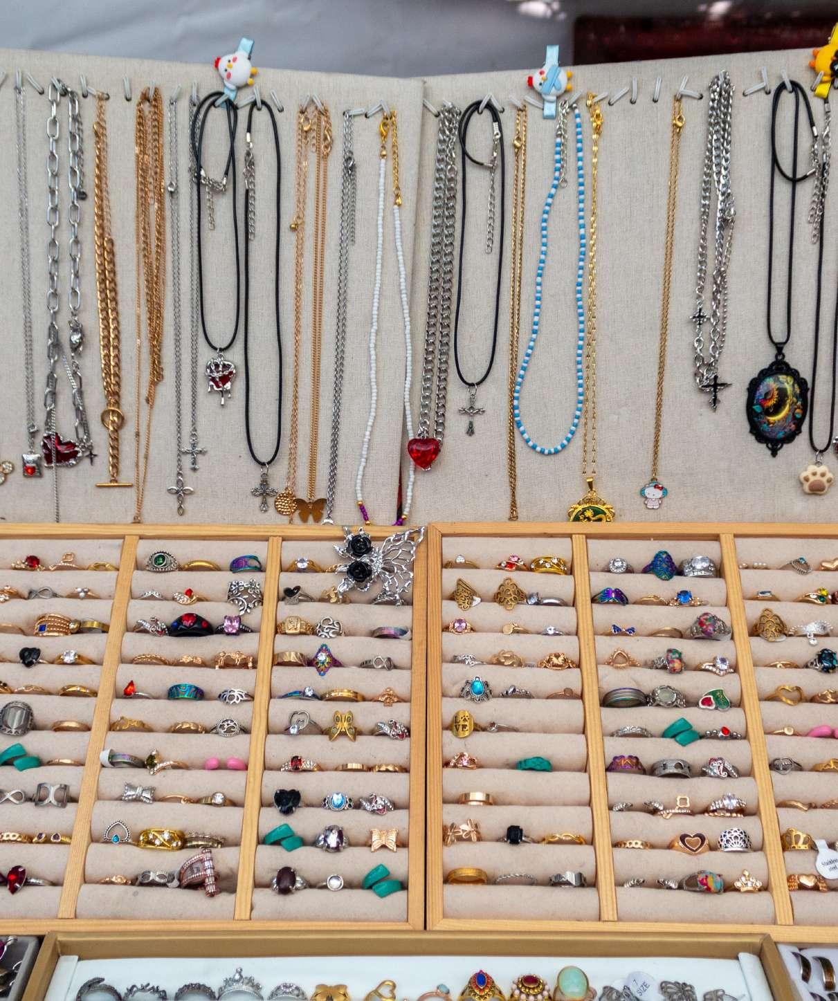 Durante mi recorrido, capturé la variedad de productos que se ofrecían en los diferentes stands. Había una amplia selección de accesorios, como pulseras, anillos y aretes, que destacaban por su diseño artesanal. También encontré ropa de segunda mano con estilos únicos, puestos de flash tattoos que llamaban la atención por su originalidad.