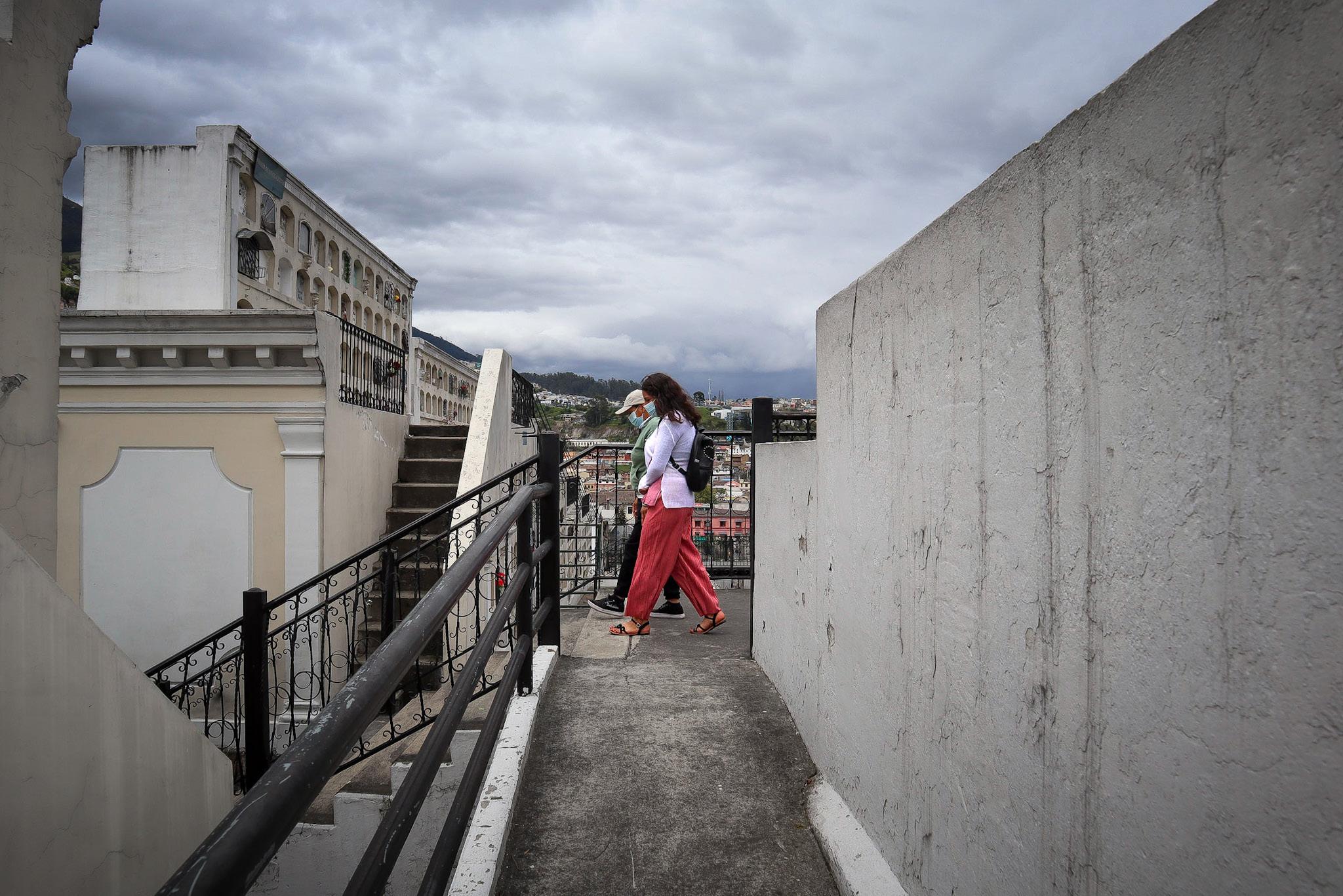 Páginas anteriores. 1. Perspectiva de la colocación de tumbas tipo jardín. 2. Personas dirigiendose hacia las gradas que conducen a los siguentes pabellones. 3. Perspectiva de uno de los pabellones del cementerio de San Diego. 4. Hombre de rodillas contemplando una lápida adornada con flores. Quito, 2022.