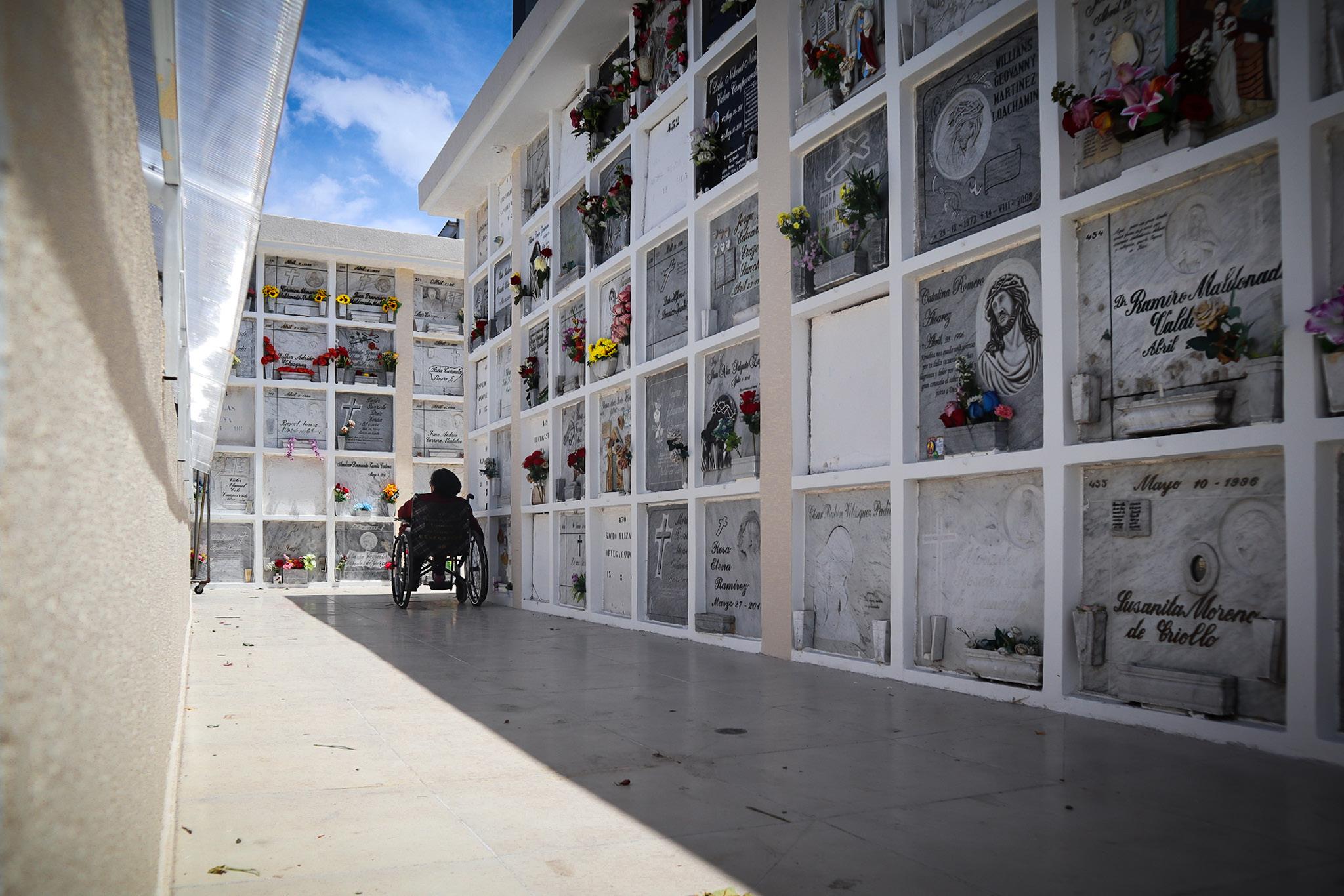 Página anterior. 1. Entrada al cementerio por la calle De Las Bugambillas, en el edificio se encuentra el nombre de la fundación fundadora del cementerio y se indica que en este se encuentra la sección de los columbarios nominada “Ciudad Luz”. 2. Fotografía realizada en la parte principal del cementerio tipo jardín donde una señora de edad mayor y un joven caminan entrelazados de las manos. 3. Sección del cementerio donde se encuentran edificaciones de cinco niveles con nichos y tumbas en el suelo. Abajo. Mujer en silla de ruedas posicionada en la sombra admirando una lápida. Quito, 2022.