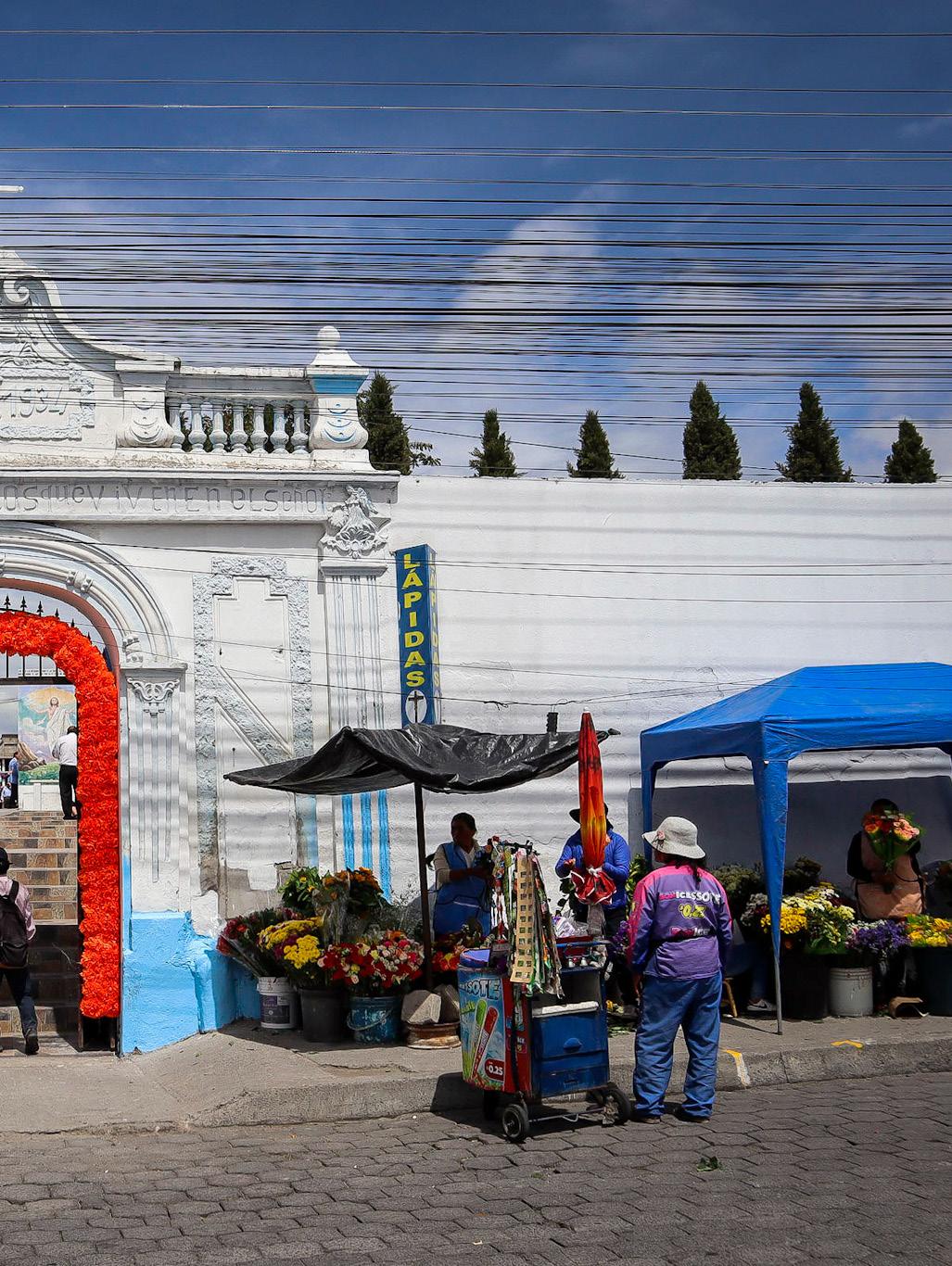 Página anterior. Entrada a las salas de velación del Cementerio “El Batán”, se observan varios vendedores ambulantes posicionados sobre la calle Río Coca. Quito, 2022.