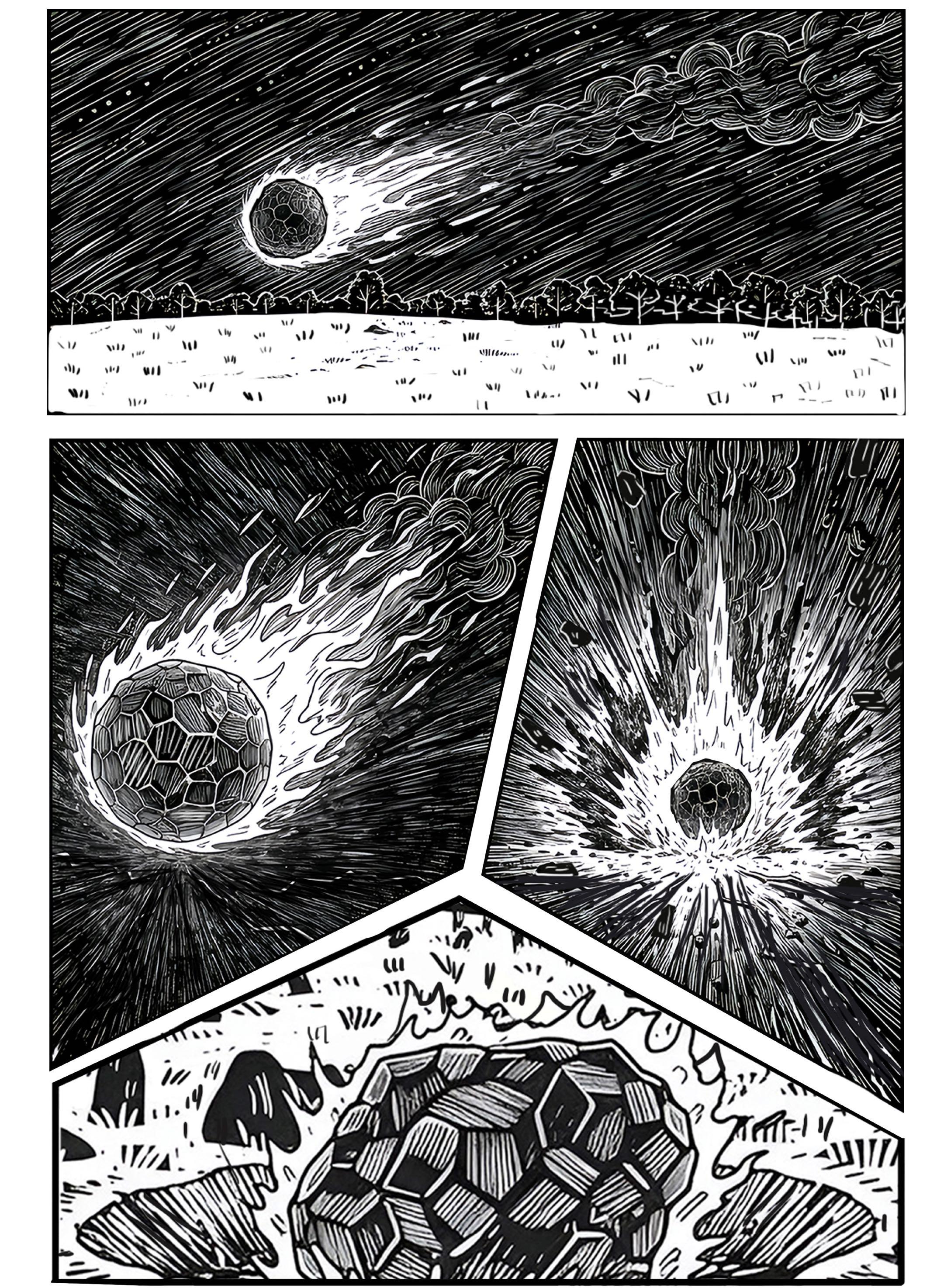 Cuenta el mito que Quillusara nació del cielo. Un meteorito cayó sobre la tierra, marcando el lugar con una energía poderosa que dio origen a los monolitos. Las viñetas representan ese instante cósmico donde el fuego celestial toca el suelo, transformando el paisaje en un sitio sagrado, elegido por las fuerzas del universo.