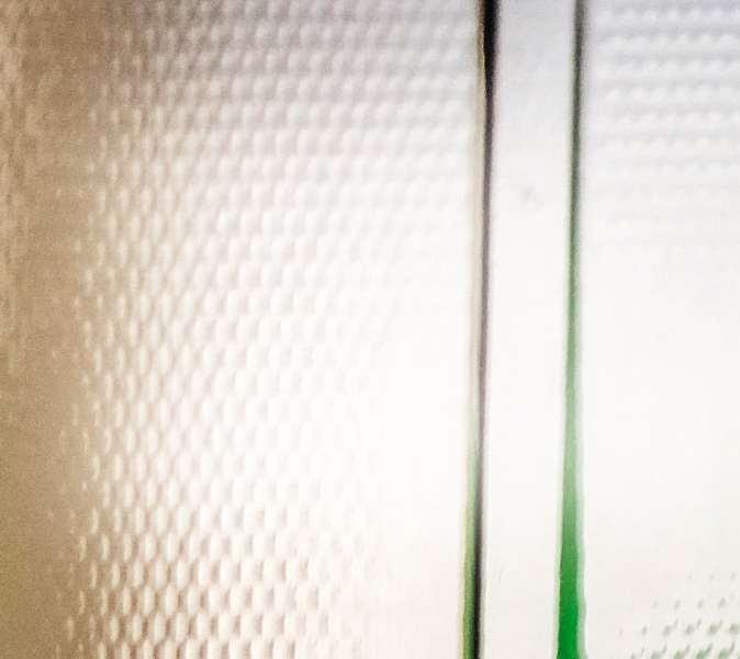 Das Gesicht wird durch die Scheibe nur schemenhaft angedeutet. Einzig Nase und Mund erscheinen mehr oder weniger deutlich durch den Spalt. Fokussiert wird auf die Glaskante.