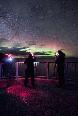 Polarlichterkönnen,abhängigvomErdmagnetfeld,inganzunterschiedlicher Form auftreten.AuchdieFarbe kannvariieren. Daher lohnt es sich, das Phänomen längere Zeit,womöglichsogardieganzeNacht,zubeobachtenund seine verschiedenenFacettenzu fotografieren. Fotograf Ollie Taylor berichtet zumBeispielübereinenächtlicheFoto-Session im Norden Großbritanniens, bei der sich das Polarlicht mehrfach veränderte.Erstbegannes als Glühen, formte dann aber nach und nach einen Bogen am Himmel mit einem Abstand zum Horizont. Im Laufe der Nacht verstärkte sich das Licht immer mehr und bildete einen doppelten Bogen. Dieser sah aus wie ein Vorhang,dersichimWindbewegt.