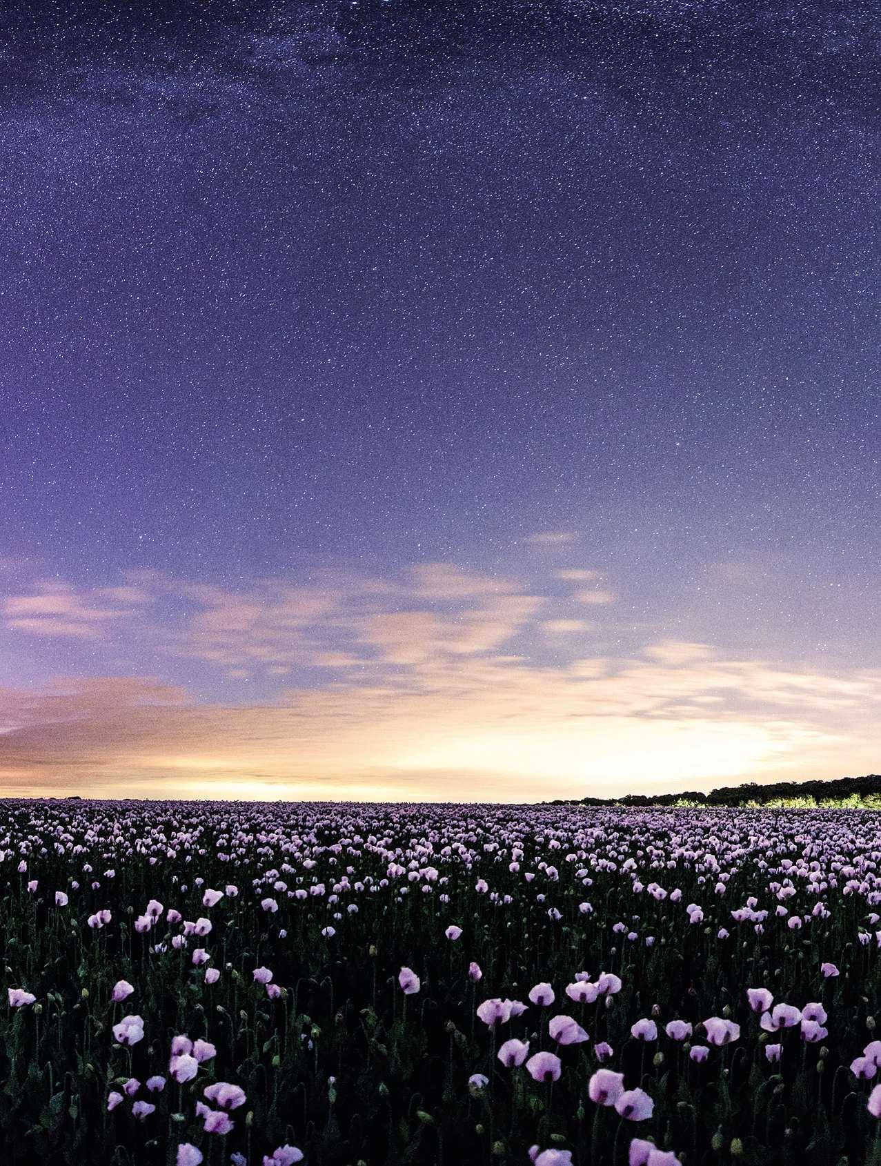Ein Feld voller Schlafmohnblumen. Am Himmel glüht ein schwaches Polarlicht, die Milchstraße sowie die Andromenda-Galaxie.