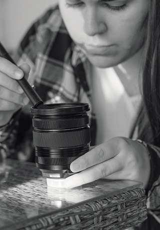 Ölige Flecken oder kleine Staubkörner können Sie mit einem „Lensbrush wegpinseln Streichen Sie dazu mit einem weichen Objektivpinsel (normale Pinsel sind zu hart) über das Glas Um zu vermeiden, dass Sie Fett und Schmutz aufnehmen und damit über das Glas wischen, sollten Sie mit der Reinigung der Frontlinse beginnen, bevor Sie zum Objektivtubus übergehen